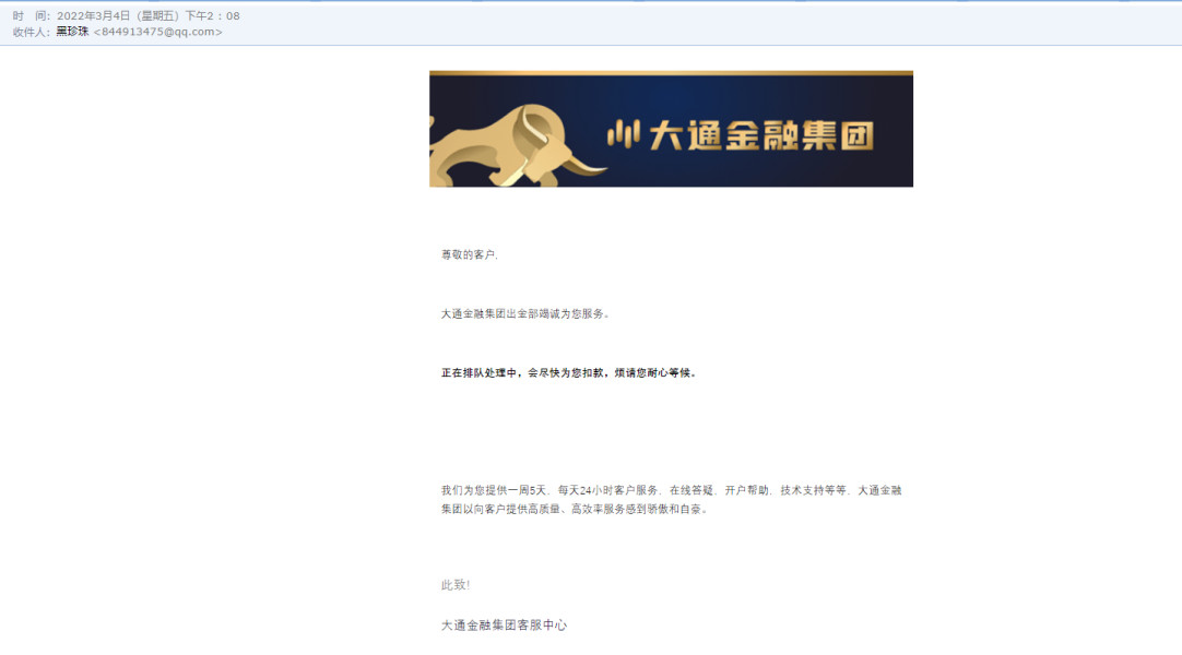 2月28日申请出金,3月4日未到账,发邮件咨询,给我们回复是“正在排队处理中,会尽快为您扣款,烦请您耐心等待”