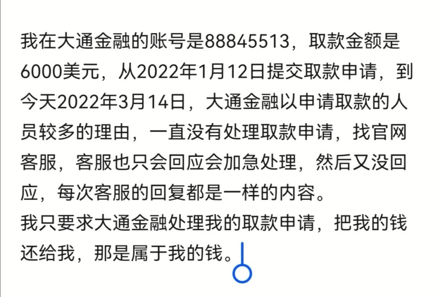我在大通金融的账号是88845513,目前取款金额是6000美元,从2022年1月12日提交取款申请,到今天2022年3月14日,大通金融以申请取款的人员较多的理由,一直没有处理取款申请,找官网客服,客服也只会回应会加急处理,然后又没回应,每次客服的回复都是一样的内容。 我只要求大通金融处理我的取款申请,把我的钱还给我,那是属于我的钱。