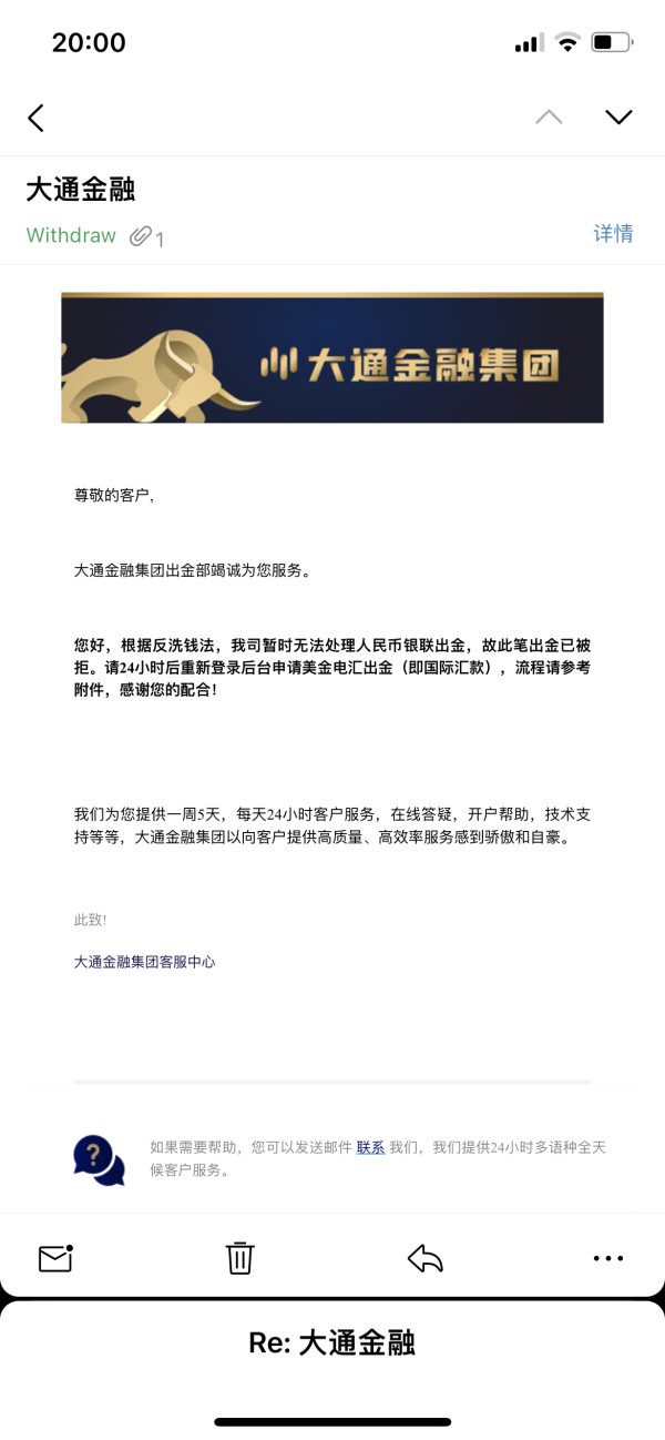 我的交易账号33514088,申请146794美元的银联出金为什么拒绝?很多的已经收到了银联出金,只要去外网投诉大通会发协议然后给你打人民币,那是我的钱,大通摆烂真恶心!