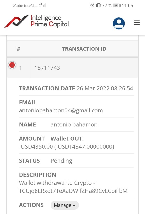 El día 26 de marzo de 2022,a las 8:26am se realiza el retiro del total del capital de 4350usd,pero aún no se ve reflejado el. Pago en mi billetera de Binance, mi correo es Antoniobahamon04@gmail.com, mi numero de cuenta del. Bróker ipcapital es: 4310724 así también hay mucha gente con el mismo problema. Agradezco su generosa gestion para que podamos hacer efectiva la denuncia y la respectiva devolución del capital de inversión.