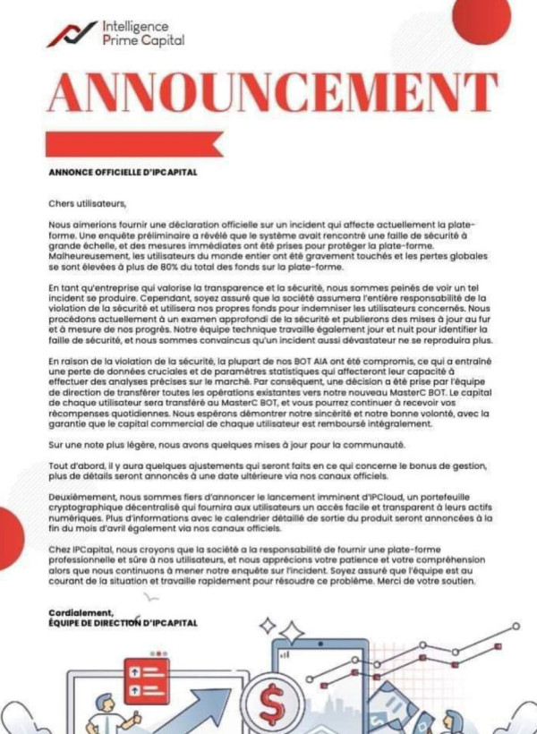 I entered IPC capital a few weeks ago with all the savings I had, and now coincidentally they say that they had a security problem and they withheld all the people's money. I did not make a single dollar of profit because they did not give me my profits. They stayed for them and my money is frozen, they transferred us to a supposed new BOT without authorization and now they force us to leave the capital for 100 days but they don't give us profits either, they don't let us withdraw capital and the profits are left to them, they are a fraud the email you gave us is not working
