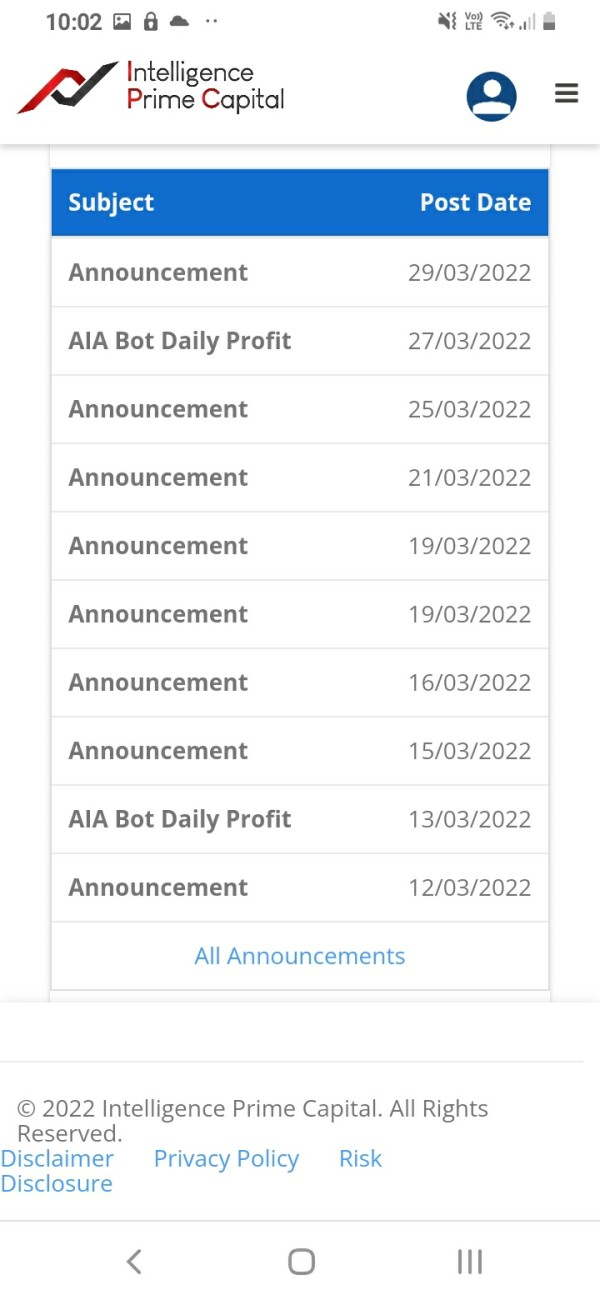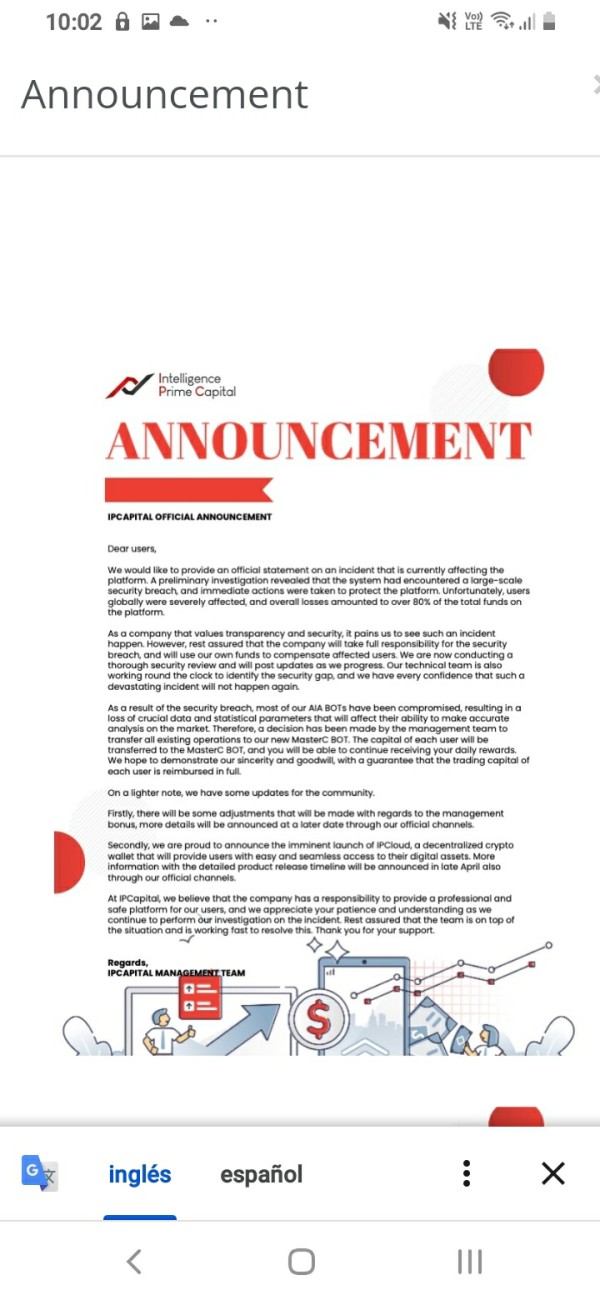 Buenos días le saluda Cliff Villalobos inversor de intelligence prime capital con cuenta número 2889130. las cueles la empresa intelligence prime capital no está cumpliendo no esta pagando desde el 19 de marzo. Aduciendo muchas actualizaciones de la plataforma con muchas escusas de problemas que a nosotros no nos compete. y por último el 29 de marzo nos dijeron que fueron víctimas de haqueo de los cuales solo son comunicados pero sin ningún sustento válido. acudo a ustedes para que la empresa pueda regularizar o en todo caso se pronuncie al respecto como será denuestro capital invertido. y no estar expuesto a un exposición de fraude inducido. y estar seguros que nuestros capitales están en empresas reguladas. optube su servicios para un robot de forex de las cuales nos cambiaron las condiciones y nos pasaron a otro robot y pretenden congelar las cuentas por 100 días sin previo aviso las cuales no estoy de acuerdo.
