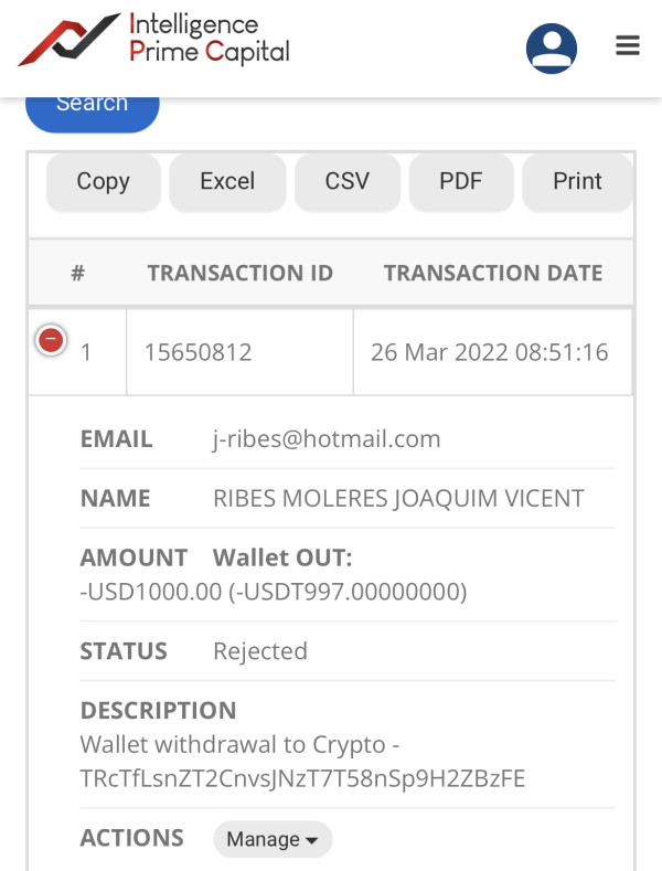 El pasado sábado 26/03/22 hice un retiro de 1000 usdt desde mi wallet de ipc a mi cuenta de binance pero me la han denegado y no me han devuelto el dinero a mi wallet. Ese dinero ha desaparecido, no se ve reflejado en ningún sitio ni en mi cuenta.