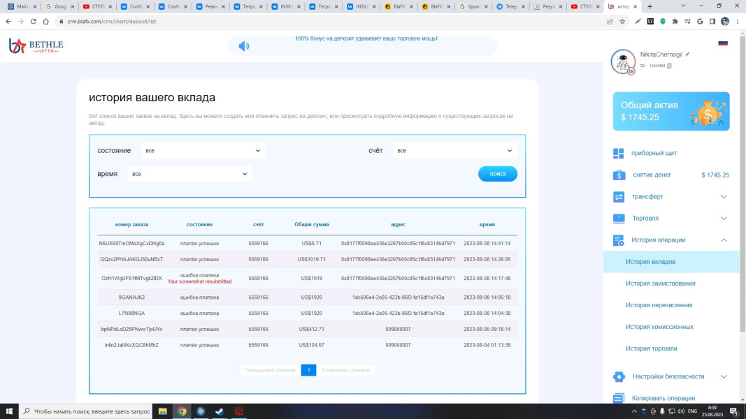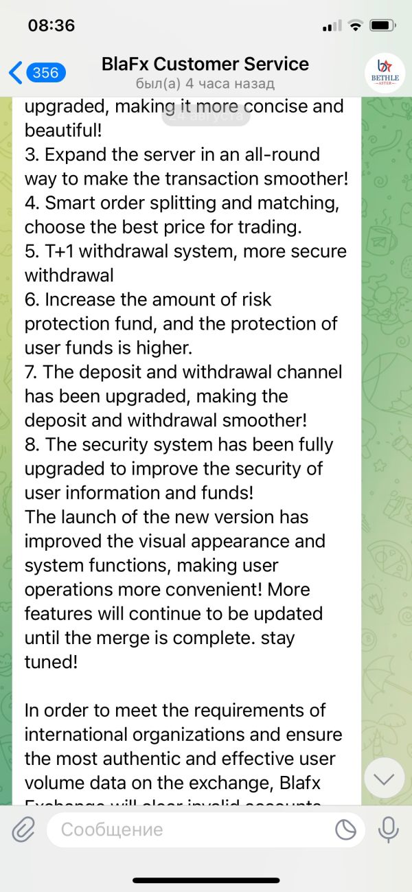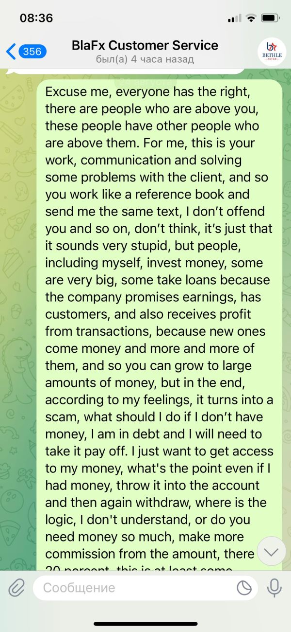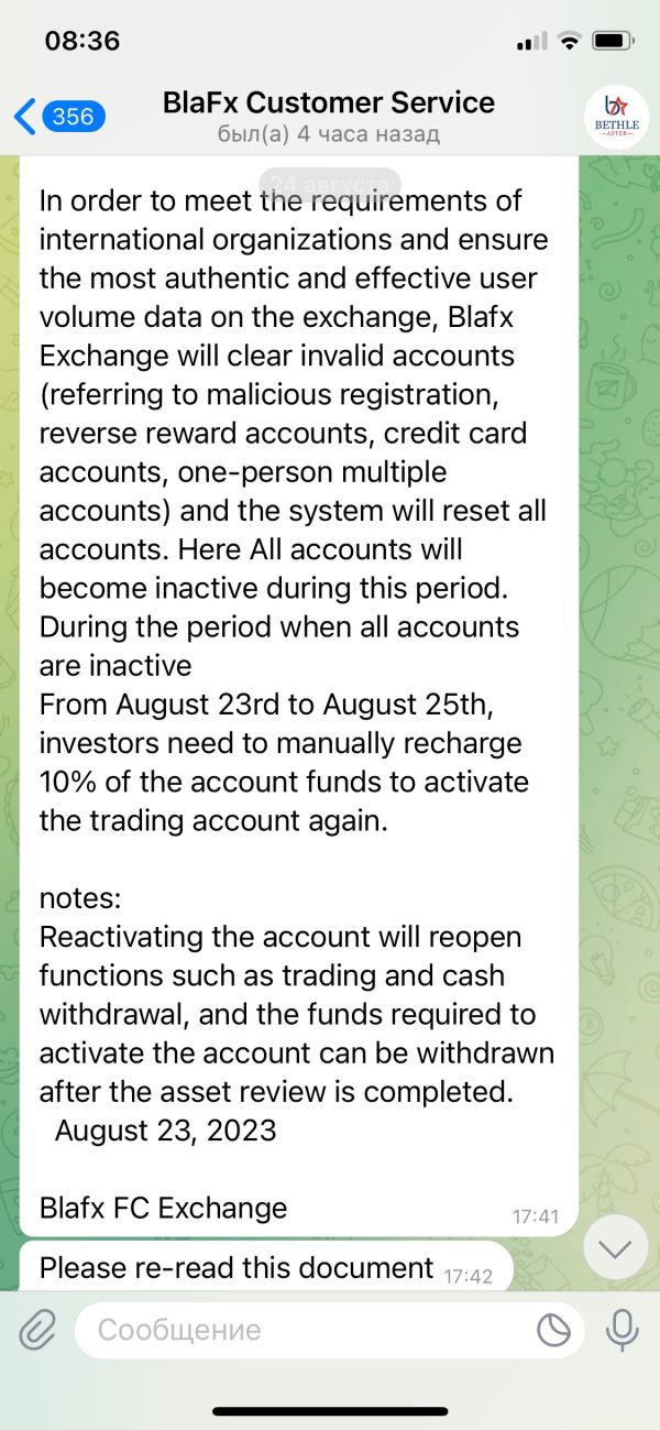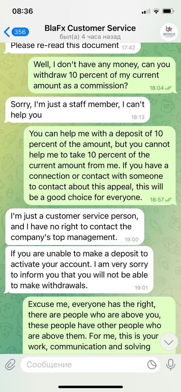 Здравствуйте. Меня зовут Черногиль Никита Витальевич . Я являюсь инвестором биржи Blafx. Хочу сделать заявление о невозможном выводе денежных средств с моего торгового счета. В настоящее время на платформе запретили вывод денежных средств. О сложившейся ситуации мною не было получено ни одного уведомления. Служба технической поддержки держит обратную связь и требует немедленного пополнения 10% от депозита на мой аккаунт для разморозки торгового счета. Номер торгового счета: 5559166. В случае не пополнения и не выполнения данных условий аккаунт будет удален со всеми денежными средствами. Баланс моего счета: 1745 $ Рассчитываю на ваше вмешательство и скорейшую обратную связь. С Уважением, инвестор платформы Blafx