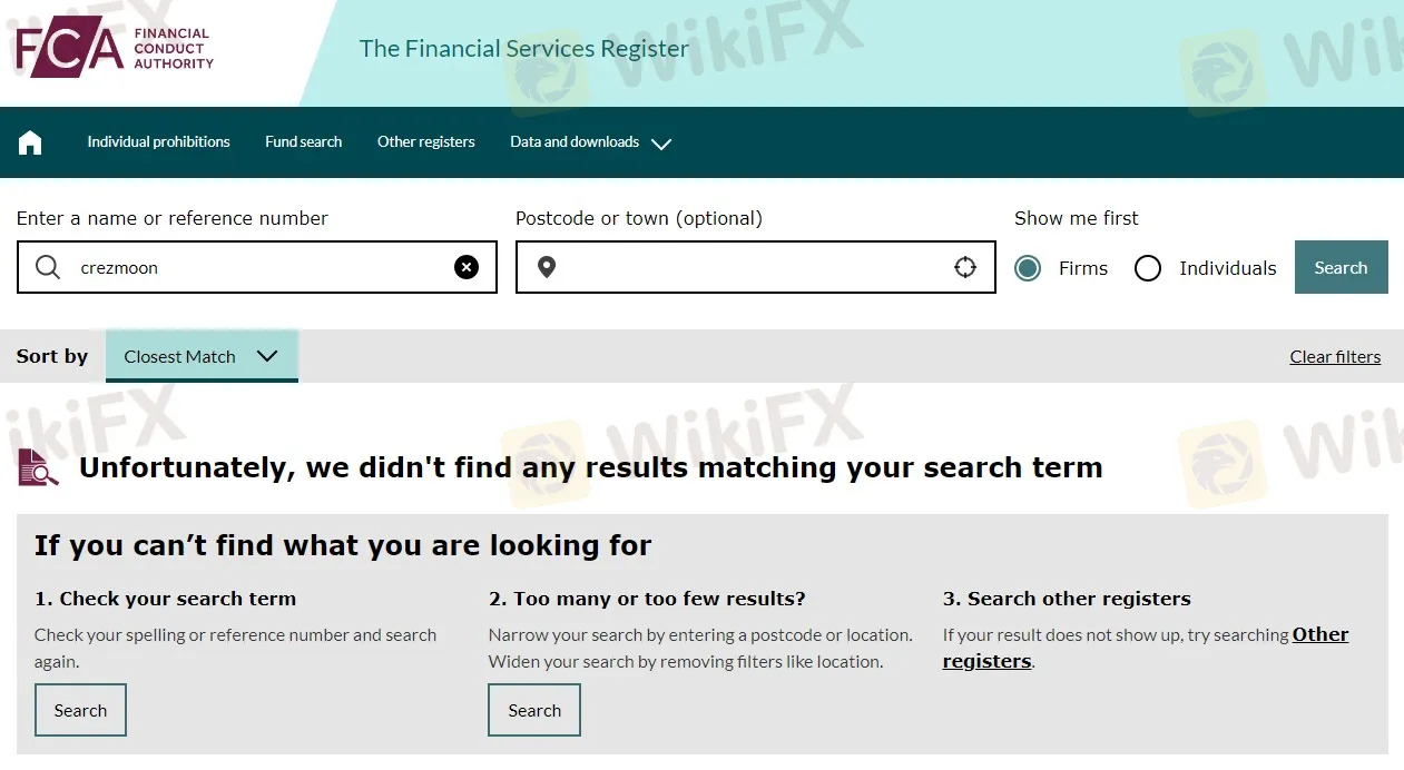 If Crezmoon is an illegal forex broker in the UK as it claims, it must be regulated by UK FCA, according to local laws. However, we did not find its regulatory information in the UK FCA register. Not regulated by UK FCA, Crezmoon shall not provide financial services or sell financial products in the UK.