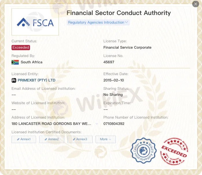 PrimeXBT operates under a multi-jurisdictional compliance framework that enhances the security of its forex and crypto traders. We verified that PrimeXBT holds an FSCA license (South Africa, No. 45697), a Saint Lucia registration (No. 2024-00343), and a Seychelles FSA license (SD162). These regulatory structures are critical in determining the platforms legal legitimacy and the safety of client funds.