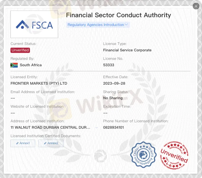 The FSCA is a reputable authority that oversees financial services in South Africa, ensuring the protection of clients and proper handling of investments. Despite the license being listed, it is important to note that the “unverified” status raises concerns about its regulatory compliance.