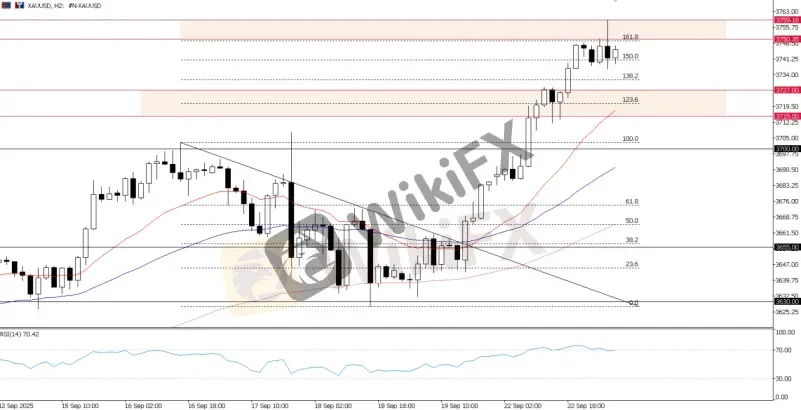 From a technical perspective, gold is now hovering near the $3,759 record high, this aligns with the Fibonacci extension 161.8 that we covered earlier, which suggests the rally over the current wave could face some challenge.
