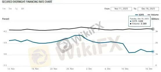 SOFR, a key indicator for assessing U.S. dollar liquidity, is currently holding at 3.69%, below the upper bound of the Federal Reserves interest rate corridor (IORB). This suggests that liquidity conditions within the banking system remain healthy.