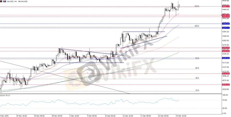 Gold continues to lead the year-end “Santa Rally,” maintaining structural strength despite thinning liquidity across global desks. The $4,500 handle now carries more psychological weight than technical resistance. After briefly dipping toward $4,450 before the Christmas holiday, gold gapped higher in Asia, reopening above $4,500 and briefly touching new highs.