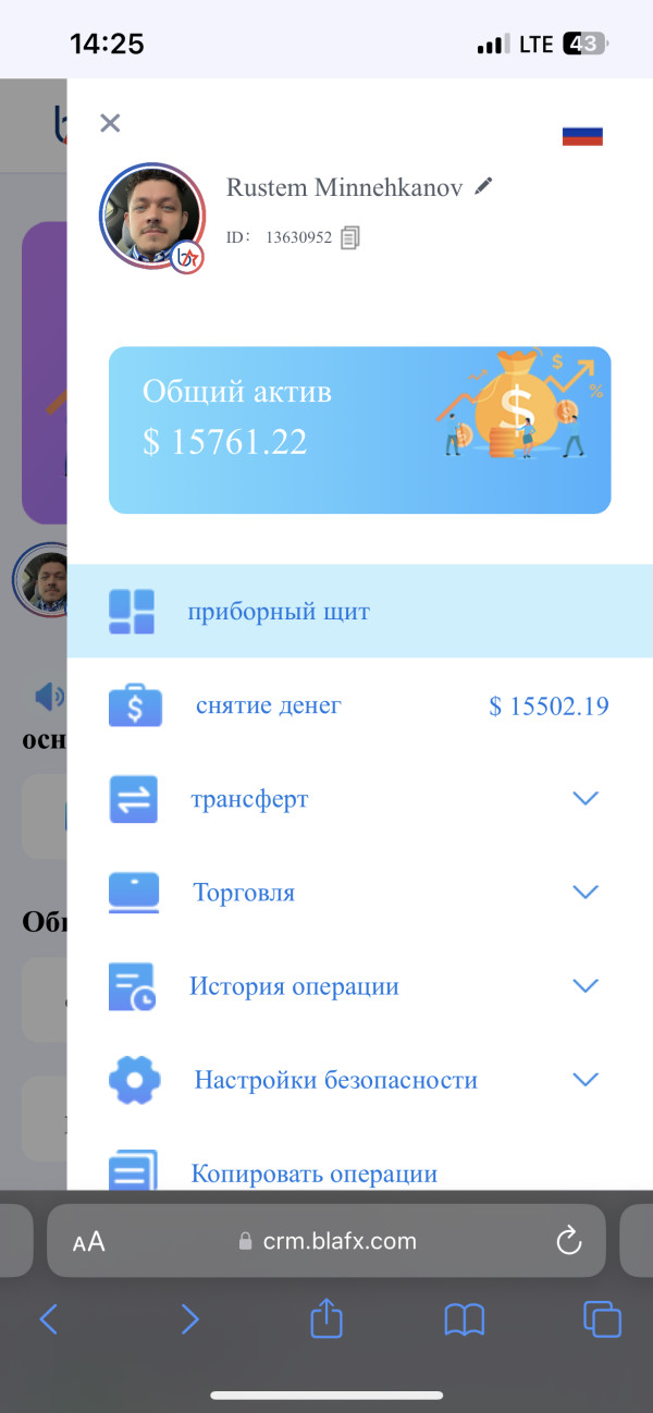 Треидер Blafx.com обманным путем провел акцию с 18.08.2023г без предупреждения и согласия пользователе й (копитрейдеров) акцию+100% К пополняемому депозиту и заблокировали вывод средств до конца акции 25.08.2023г. 22.08.2023 на Blafx.c от прекратились торговые операции с Meta Trader 4 и заблокировал вывод средств в статусе (в настояще е время имеются необработанные заказы на вывод или перевод, и последняя операция не может быть выполнена ,пожалуйста,дождитесь обработки) со счета. Сумма моего депозита 15761$ прикладываю скриншоты с аккаунта Blafx.com С 25.08.2023г на сайте появилось сообщение о реструктуризаци и и внесение налога (залога) в 27% от имеющегося депозита, если мы хотим вывести свои средства. После 25.08.2023г. По окончанию акции политика вывода средств не изменилась. Начиная с 25. 08. 2023 средства вывести не возможно, пишет что средства находятся в статусе "на рассмотрении". Надеюсь помощь и поддержку!