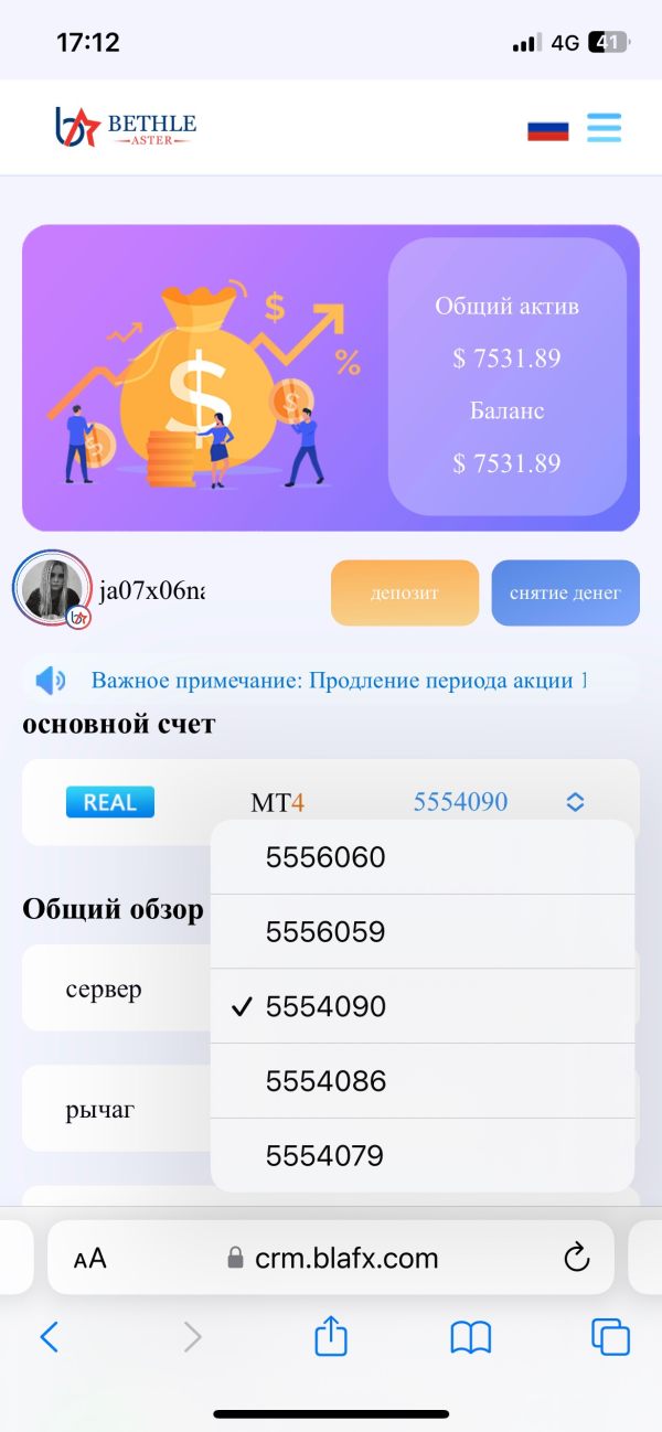 Треидер Blafx.com обманным путем провел акцию с 18.08.2023г без предупреждения и согласия пользователей (копитрейдеров) акцию+100% К пополняемому депозиту и заблокировали вывод средств до конца акции 25.08.2023г. 22.08.2023 на Blafx.c от прекратились торговые операции с Meta Trader 4 и заблокировал вывод средств в статусе (в настоящее время имеются необработанные заказы на вывод или перевод, и последняя операция не может быть выполена ,пожалуйста, дождитесь обработки) со счета. Сумма моего депозита 7531$ прикладываю скриншоты с аккау нта Blafx.com C 25.08.2023г на сайте появилось сообще ние о реструктуризаци и внесение налога (залога) в 27% от имеющегося депозита, если мы хотим вывести свои средства. После 25.08.2023г. По окончанию акции поли тика вывода средств не изменилась. Начи ная с 25. 08. 2023 средства вывести невозможно, пишет что средства находятся в статусе "на рассмотрении". Надеюсь помощь и поддержку!