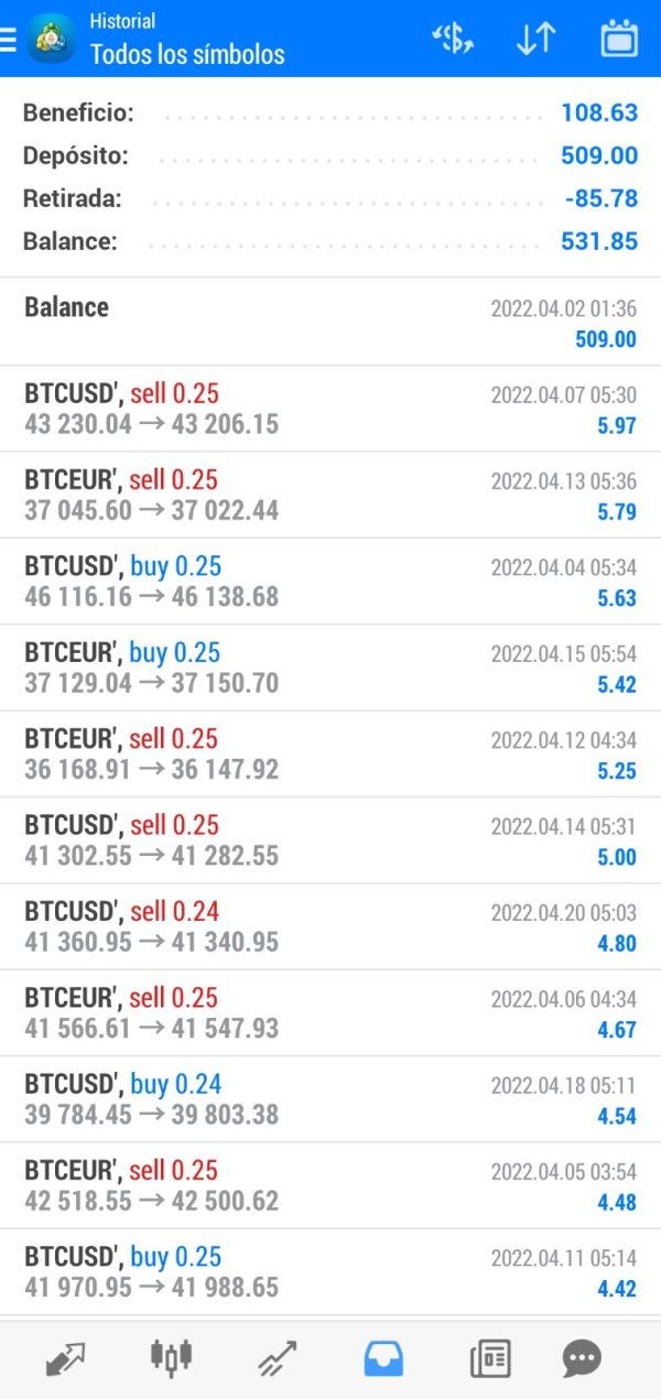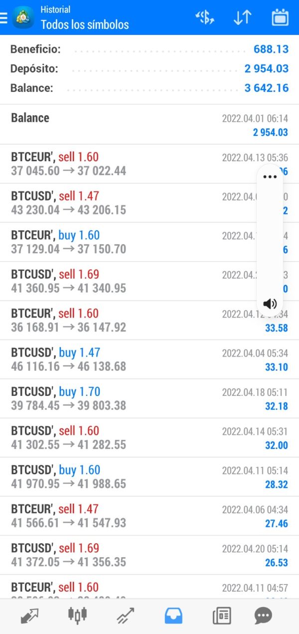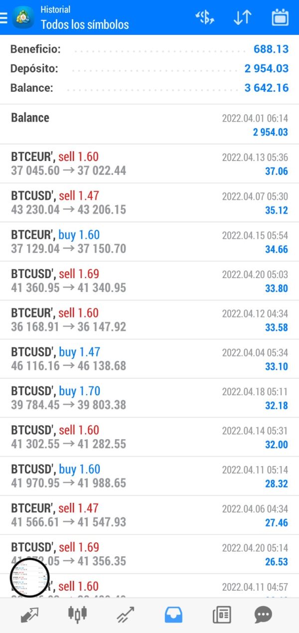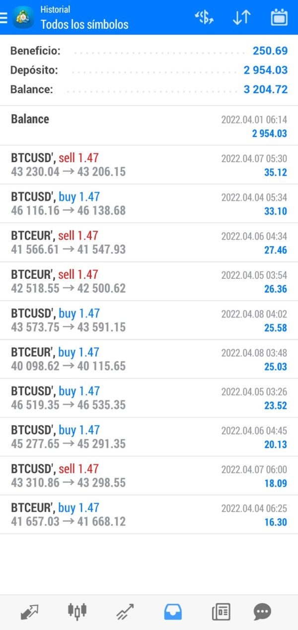 TENGO INVERTIDO 2300 USD EN UNA CUENTA Y 500 EN OTRA QUE SE PROMOCIONO COMO UN BOT ESPECIFICO DE CRIPTOMONEDAS. HACE 30 DIAS EL MT4 SIGUE OPERANDO MI CAPITAL SIN EMBARGO EN LA PLATAFORMA TENGO TODO EN 0 (CEROS) INCLUSO EN LA OTRA CUENTA DE MASTER C BOT SEMANALMENTE EL MT4 OPERA PERO VUELVE SEMANALMENTE AL CAPITAL INICIAL DESCONTANDO LAS GANANCIAS COMO RETIROS.
