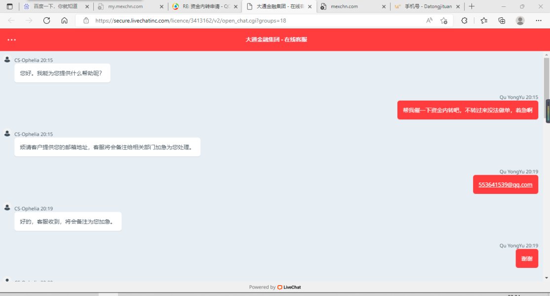 我在大通金融MT4系统(交易账号:33513862)2021年12月3日和2021年12月8日两笔共计申请出金1117.92美金,到现在已经半年多了,期间多次联系客服催促,开始还说会给加急处理,后来就是说帮催促相关部门,最近的一次竟然说他们客服又不能给客户打款,我实在是没法忍受了,请相关部门给予尽快解决。