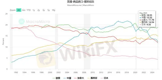 Dari sudut pandang yang lebih makro, mari kita lihat perubahan pangsa impor barang dari negara mitra dagang utama AS sejak tahun 2018. Sejak 2018, pangsa impor AS dari Tiongkok turun dari 21,69% menjadi 12,22% pada Mei 2025, mempertegas tren “decoupling” AS dari Tiongkok.