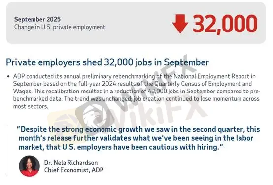 Data ADP bulan September tercatat -32.000. Hanya sektor pertambangan, teknologi informasi, serta pendidikan & kesehatan yang mengalami peningkatan tenaga kerja, sementara sektor lainnya mencatat pertumbuhan negatif. Kepala Ekonom ADP, Dr. Nela Richardson, menilai perusahaan AS tidak memperluas perekrutan meskipun pertumbuhan ekonomi kuartal II cukup kuat, dan masih bersikap hati-hati terhadap prospek perekrutan.