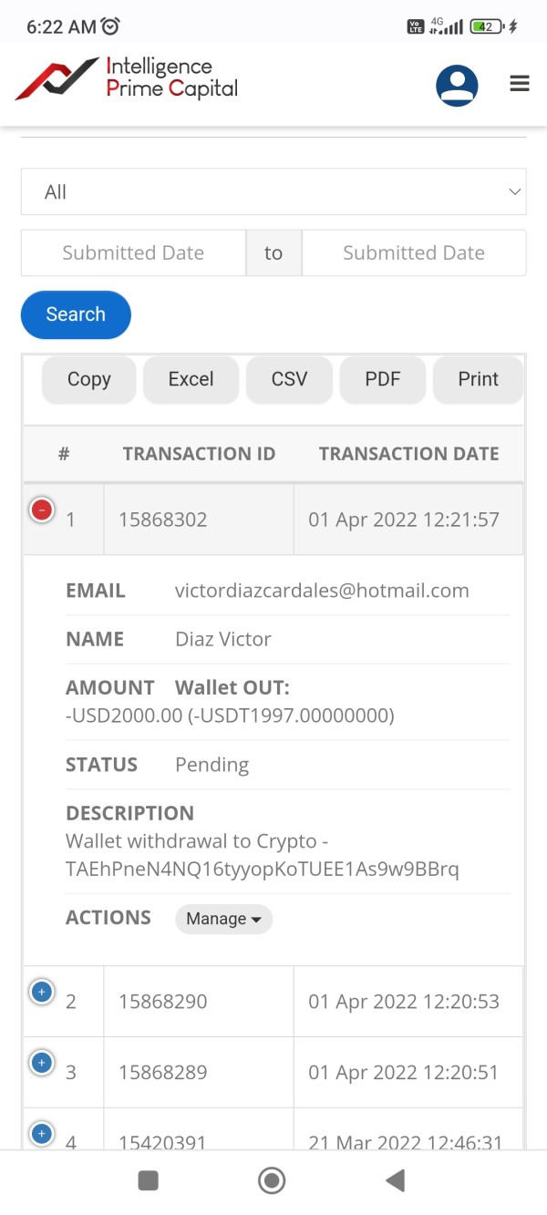 Retiros rechazados desde el 18 de marzo, retiro pendiente del 01 de abril. No cargan las utilidades de las últimas dos semanas. Los saldos disponibles en la billetera para retiro han desaparecido.