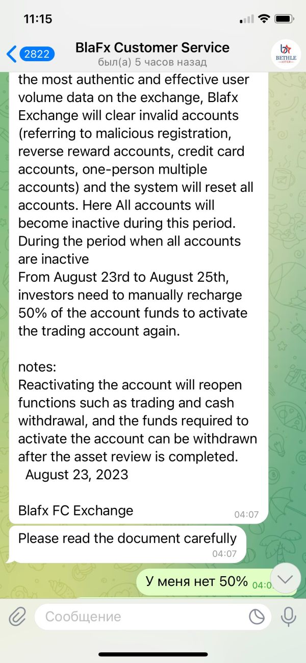 Добрый день! Перестал функционировать личный аккаунт на blafx.com, не могу вывести свои денежные средства. Техподдержка сайта отвечает по-разному. Сначала просили внести 10% депозита для активации аккаунта, затем просили внести 27% налога на мои средства, далее попросили 50% от моего депозита. Я ничего не вносила, так как нет отпределенности, никто не может ответить, смогу ли я вывести свои деньги. Помогите разобраться в ситуации.