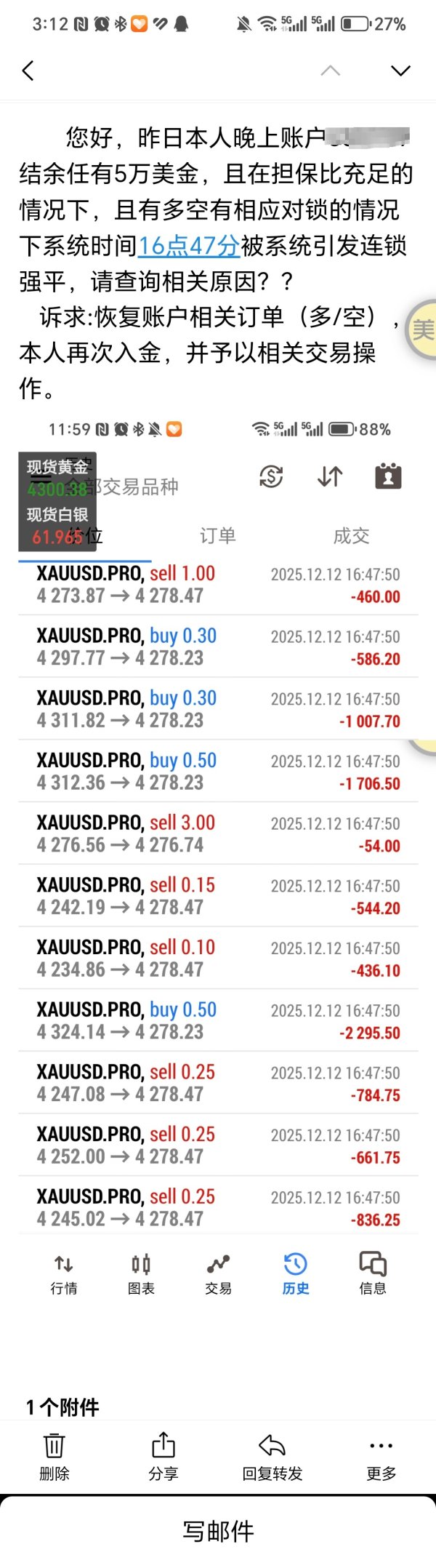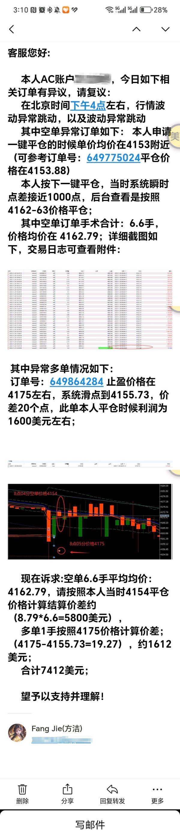 11月29日,滑点1万美金,处理无果。在北京时间下午4点左右,行情波动异常跳动,以及波动异常跳动,其中空单异常订单如下: 本人申请一键平仓的时候单价均价在4153附近(可参考订单号:649775024平仓价格在4153.88)本人按下一键平仓,当时系统瞬时点差接近1000点,后台查看是按照4162-63价格平仓;其中异常多单情况如下:订单号:649864284 止盈价格在4175左右,系统滑点到4155.73,价差20个点,此单本人平仓时候利润为1600美元左右; 在本月12月12日晚,本人账户结余任有5万美金,且在担保比充足的情况下,且有多空有相应对锁的情况下系统时间16点47分被系统引发连锁强平。