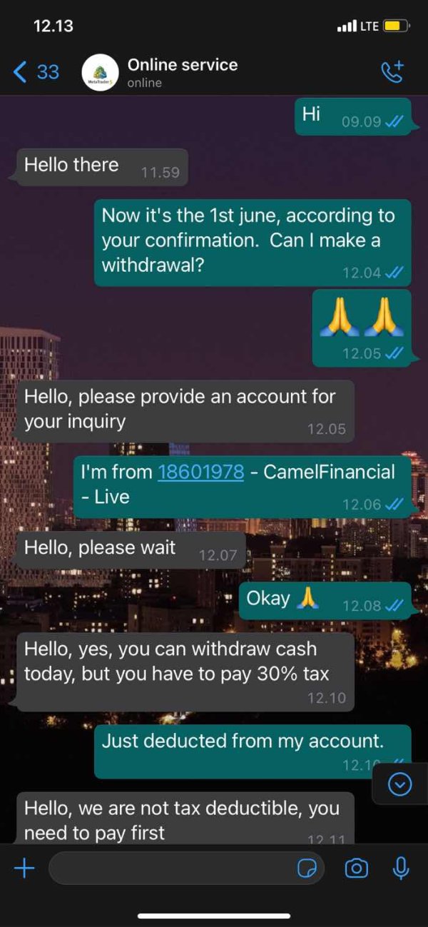 CAMEL FINANCIAL LIMITEDは人気のあるMetaTrader 5プラットフォームをサポートしていますが、重大なリスクが存在するため、これには及びません。最大の懸念は規制の欠如です。これに加えて、機能しない公式ウェブサイトがあります。WikiFXでの報告によると、引き出しの問題があることは注意が必要です。