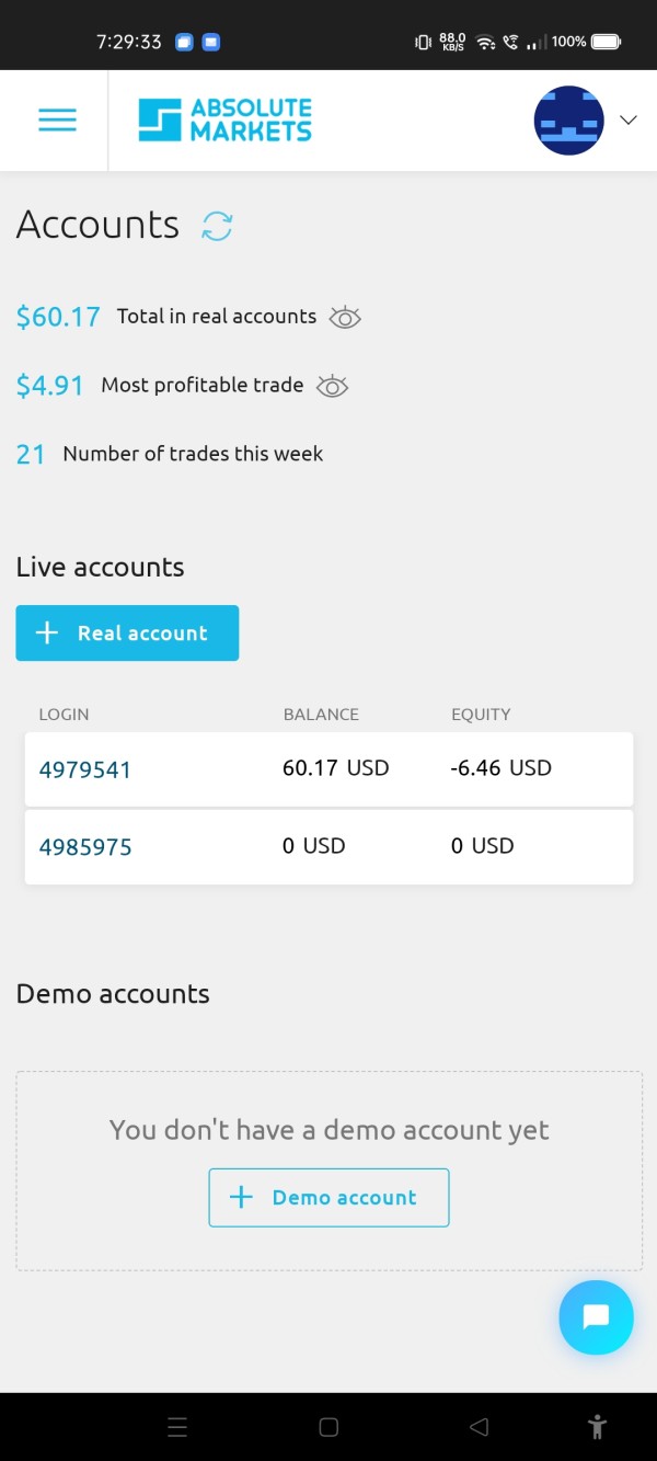 デモ口座とは別に、マイクロ、バリアブル、ecn、vip ecn 口座という 4 つのライブ取引口座が個人トレーダーとプロのトレーダーの両方向けに設計されています。に必要な最低初回デポジット Absolute Marketsたとえば、マイクロ口座は取引を開始するのにわずか 50 ドルしか必要とせず、初心者にとっては親切に見えます。変動口座は最低入金額 100 ドルを要求し、最後の 2 つの口座、ecn と vip ecn は取引を開始するために 500 ドルと 5,000 ドルを必要とします。