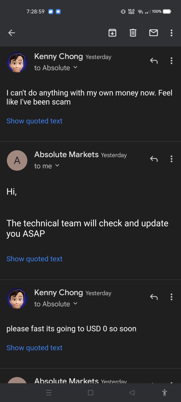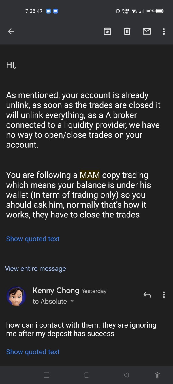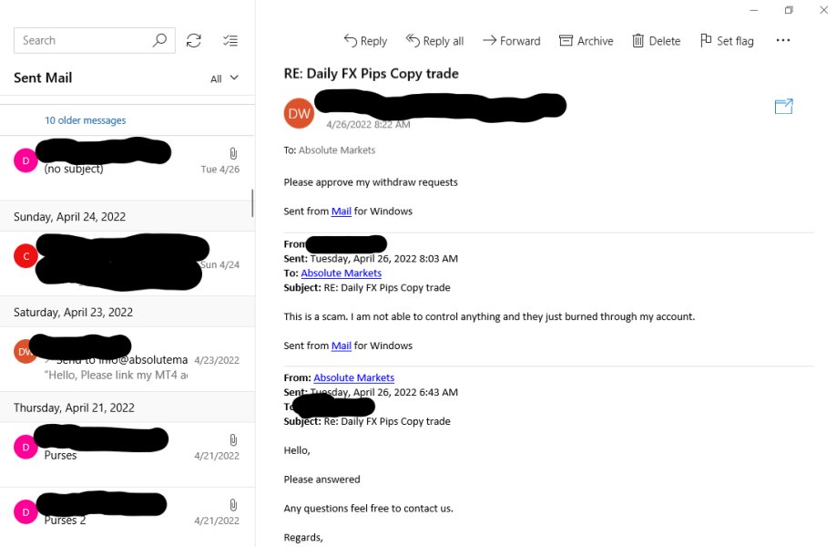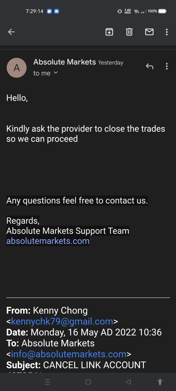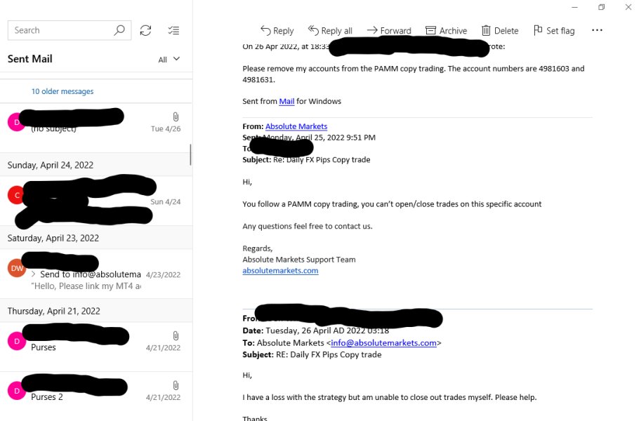 Absolute Marketsは、顧客をサポートするために、よくある質問セクションとチャットボットに大きく依存しています。市場が開いているときはいつでも、多言語を話すサポート スタッフが電話と電子メールで対応します。