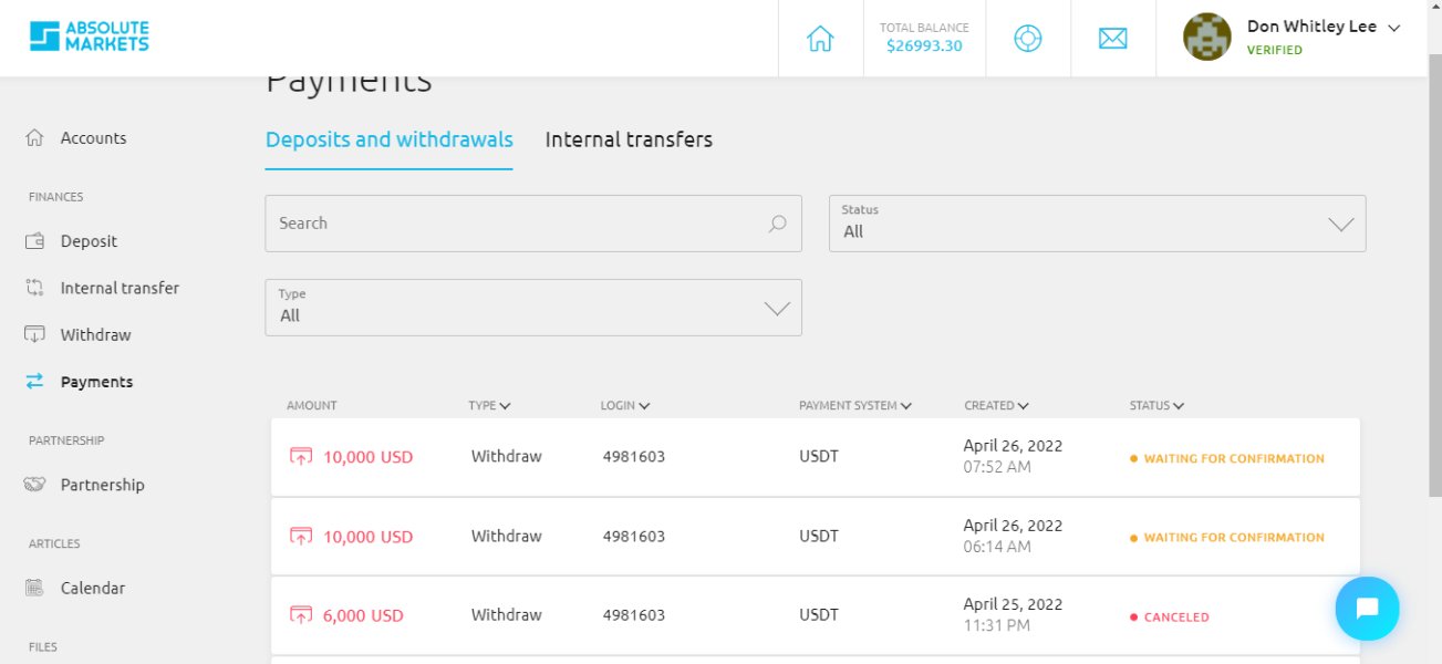 投資を開始するために必要な最低入金額は、支払いオプションによって異なり、1 ドルから 200 ドルの範囲です。 Absolute Markets投資家は、Visa や Mastercard などのクレジット/デビット カード、ビットコイン、イーサリアム、テザーなどの暗号通貨、エコバンク、銀行振込、給与引き換え、モバイル マネー、パーフェクト マネー、バーチャル ペイを介して入金することができます。国際銀行振込による入金には一部手数料が発生する場合がありますが、その他の支払い方法は無料です。処理時間は支払い方法によって異なります。