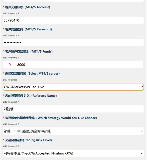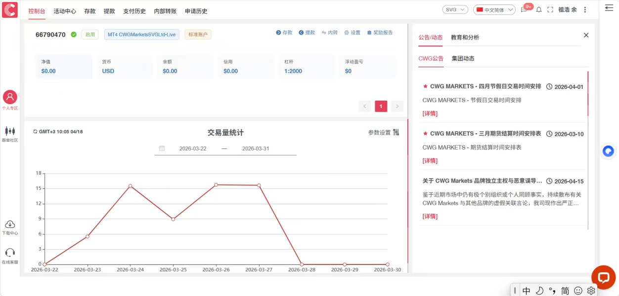CWG Marketsにはインスタント、スタンダード、アドバンスド、インスティテューショナルの4つのアカウントタイプがあります。低スプレッドとレバレッジを希望するトレーダーはインスティテューショナルアカウントを選択することができます。一方、予算が少ないトレーダーはインスタントアカウントを開設することができます。また、デモアカウントは主にトレーダーが取引プラットフォームに慣れるためや教育目的に使用されます。コピートレーディングも利用可能で、経験の浅いトレーダーや時間がないフォロワーは、経験豊富なトレーダー(マネージャーやコピートレーディングの専門家とも呼ばれる)の取引をコピーしてポートフォリオを多様化することができます。ムスリムはスワップなしのイスラム口座を開設することができます。