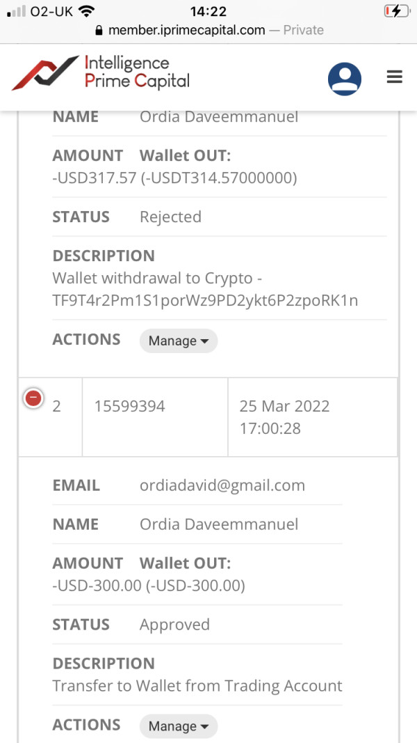 on March 19 Ipc claimed it’s system was being updated so withdrawal request were unable to take place , on. March 25th i made a withdrawal as shown on the screenshot the money left the account and the withdrawal got rejected however my funds have not been returned , I am unable to contact ipc regarding this problem today is April 5th and I can’t get my money or heard anything from. ipc , they also gave fake. email. address which I have sent emailed on multiple. occasions