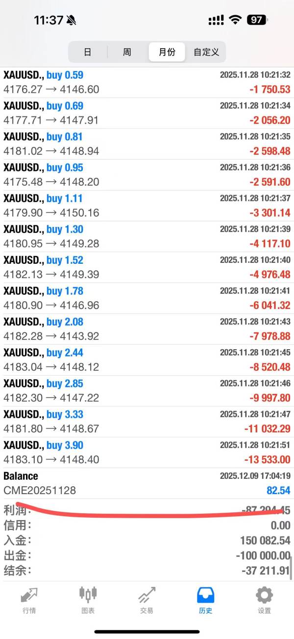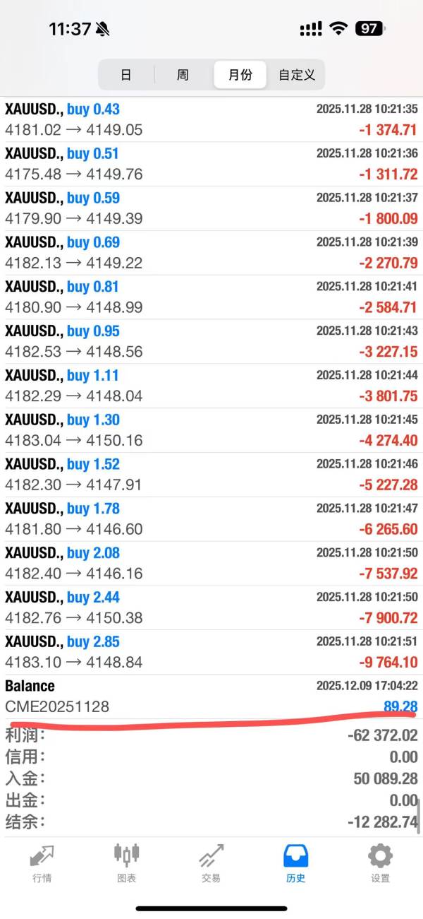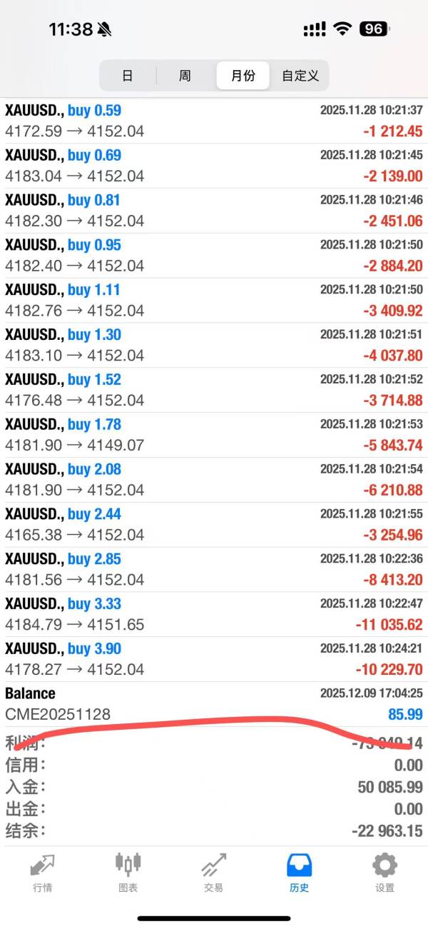 ブラックプラットフォームGMI、私の正当な権利を認めて、苦労して稼いだお金を返せ!11月28日の午後、取引所はシステム障害を起こし、スプレッドが際限なく広がりました。秩序ある市場環境を維持するどころか、マーケットメーカーは過度にスプレッドを広げ、私のアカウント全体を強制決済させました。これが私の初めての取引で、こんな災難に遭うとは。プラットフォームは完全に無責任です。 私はIBと連絡を取り、彼らはプラットフォームと補償について話し合っていると言っていましたが、何日経っても更新がありません。選択肢がなくなり、権利を守るために苦情を申し立てざるを得ません。私のIBはまた、プラットフォームがcme1***アカウントの入金額を取引口座に振り込むことで補償すると決定したと伝えました。いわゆる「補償」額は 添付画像に表示されている金額:85セント、82セント、89セント。これが補償だと?何も与えないより侮辱的だ。私たちを乞食のように扱っているのか?強制決済によるマイナス残高をカバーするのに十分な額ですらない。ただのお金の移動で、何の意味がある?これで帳消しにしようというのか? さらに、27日から28日にかけての夜間保有注文のみ補償すると主張している。ばかげている!事件は28日午後4時14分に発生した。27日を基準にするのは完全に不合理だ。すべてのルールを一方的に決め、私たち投資家やユーザーには一切の発言権がないようだ。GMI、私の苦労して稼いだお金を返せ! また、システムダウン中に執行された注文について、私は 取引所にルーティングされたか確認するための取引レポートを要求しましたが、あなた方はそれを提供しませんでした。ネットワーク接続がダウンしていたのに、どうやってルーティングできたというのでしょうか?私の口座は、あなた方の内部システムの過度に広がったスプレッドによって清算されました—きれいさっぱり消し飛ばした上、今度はCME取引所の「安定性」のせいにして責任を回避しようとしています。ブローカーの責務は、安定した取引環境を維持し、注文がスムーズに取引所にルーティングされることを保証することであって、問題が起きた時に言い訳をすることではありません。 私たちのような個人投資家のために、関係当局が正義を貫くことを切に願います。私のお金を返してください。もう取引は終わりです。総額は1,500米ドルです。