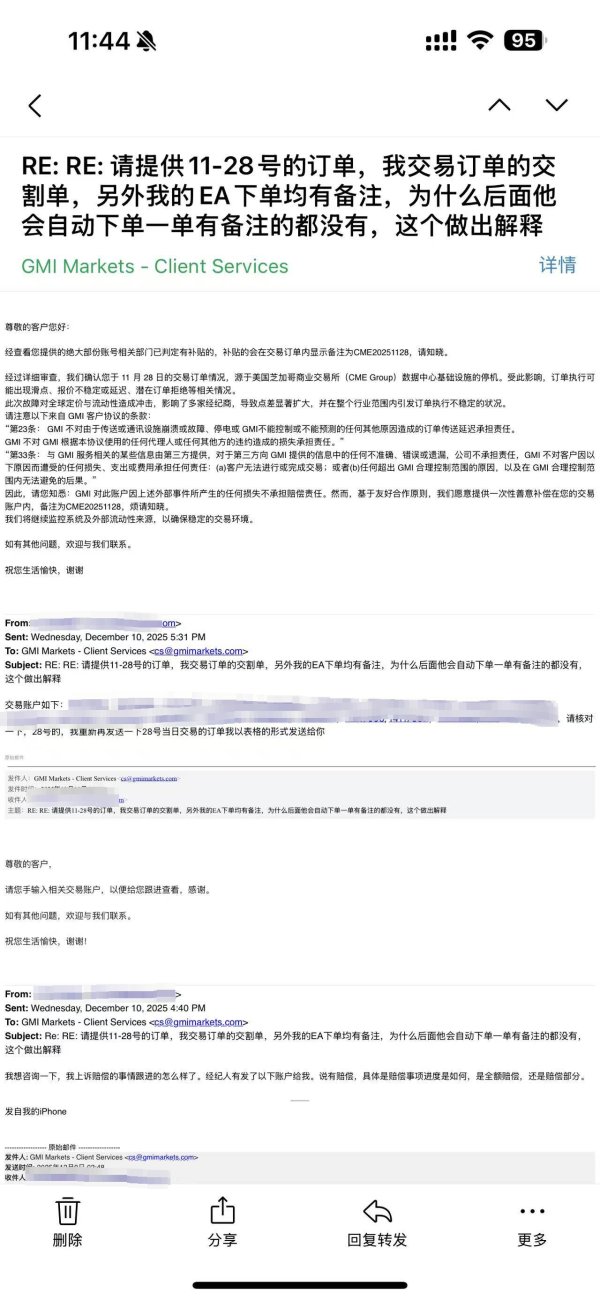 gmi黑平台还我公道,还我血汗钱 11.28号当天下午交易所宕机,出现点差无限扩大化,做市商非但没有维护好市场的交易环境反而无限扩大点差,把我的账户全部干爆仓,我第一次玩这个居然就遇到这种的事情。而且平台不作为,跟代理沟通了,代理说还在跟上面平台方沟通赔偿的事情,但是时间一天天过去,迟迟没有回复,没办法我只能选择投诉进行维权。代理还跟我说,平台那天的决定居然是后台入金cme1***的入金金额这个作为赔偿,这个一共赔偿的如图85美分,82美分,89美分,这个作为赔偿?赔偿了还不如不赔,打法要饭吗?打进来还不够抵扣穿仓的钱,这个不是左手倒右手?有意义吗?搞包吃的吗?另外还说平台只赔27号过夜的订单到28号的,你这不搞笑的吗,28号的下午4.14分就发生的事情,你拿27号的来说事情,这个合理吗,27号发生的。什么事情都是你们自己说的算,那我们投资人用户一点话语权都没有呗?GMI还我血汗钱。。另外宕机的当天交易的订单是否流量交易所,请提供我的交割清单也没有提供不出来,都没有网线了,怎么流,被你们无限扩大点差内部系统干爆仓了,干包吃了。还推卸责任说是cme交易所的稳提,券商的责任义务是维护好交易环境,确保订单顺利打向交易所。而不是出现问题一直在这那的。请各位领导为我们散户主持公道。把钱还我我不玩了,一共1500美金。