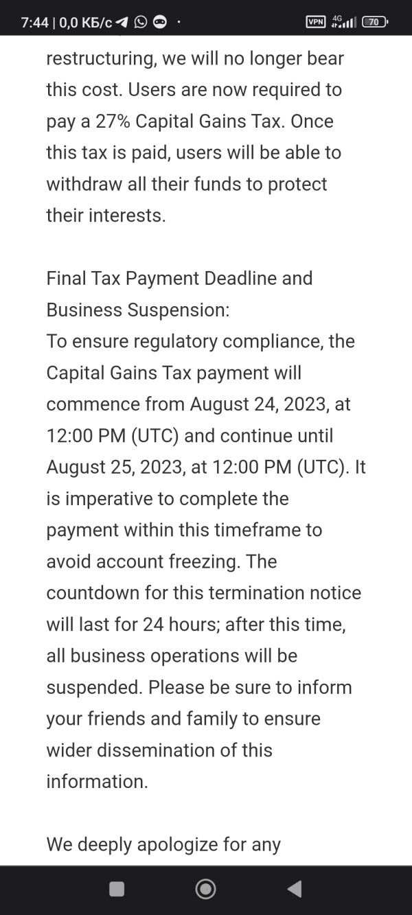 Брокер заблокировал счёт и оставил торговлю МТ4. Требует уплатить, так называемый "налог" в виде депозита в размере 27% от капитала, для разблокировки счёта. Данные действия считаю не правомерными и прошу разобраться в ситуации.