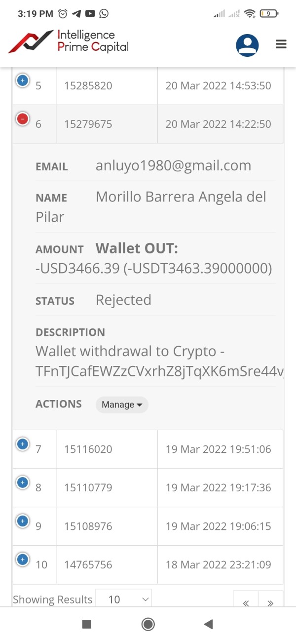 El día 18 de marzo hizo cierre el mercado y la empresa liquidan las ganancias y se podía retirar a partir del día siguiente. Me dispuse a solicitar mi dinero el di 20 en horas de la tarde y a la fecha sacan solo excusas para pagar. El día 25 se volvió a cumplir otra semana de gestión de mi capital y a la fecha no aparecen mis ganancias y tampoco deja retirar y se cae la página a cada rato. Tengo pruebas y soportes de la falta de seriedad de Intelligence Prime Capital y expongo a esta farsa de empresa para que lo comunidad de Traders y persona que somos inversora no caigan en este esquema PONZI. Mi correo es: anluyo1980@gmail.com Angela Morillo Quedo atenta y a la orden para mostrar ma detalles y evidencias. Gracias
