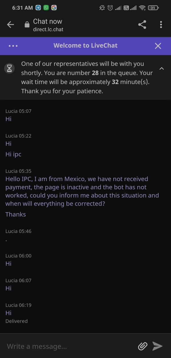 El día de hoy 28 de marzo no tengo acceso a la cuenta creada con ellos, tengo invertido 1264 dólares y no me han pagado ganancias solicitadas el 21 de marzo por 510 dólares en la plataforma, No se han depositado las ganancias generadas del 21 al 25 de marzo y hoy no ha trabajado el bot. No han dado ningún comunicado oficial, no se puede contactar a soporte.