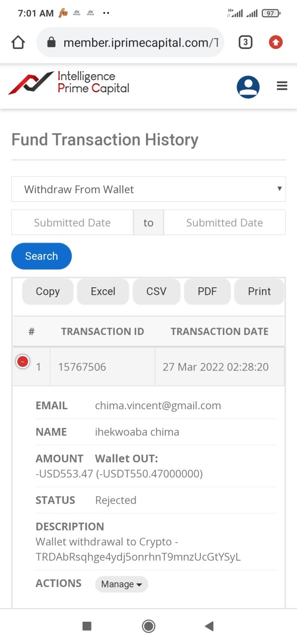 the company rejected my placed withdrawal and they it didn't also reflected back to back to my account after the rejection.