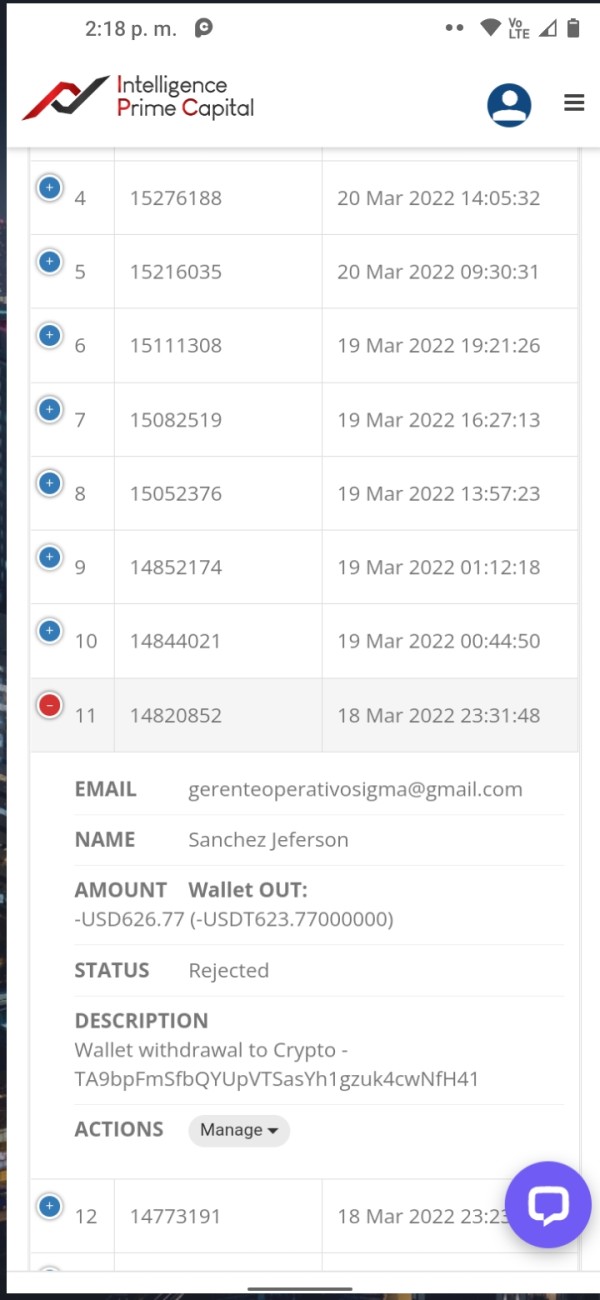 Adjunto foto de los reportes del backoffice del broker donde aparece rechazado y desde hace como 2 fin de semana se realizó el retiro y nada de nada que llegan, tampoco el chat de soporte ya no está.