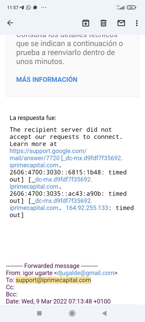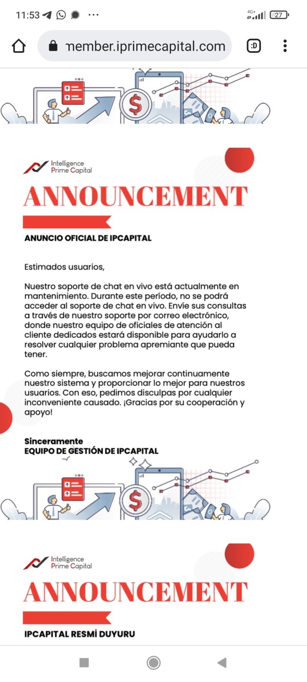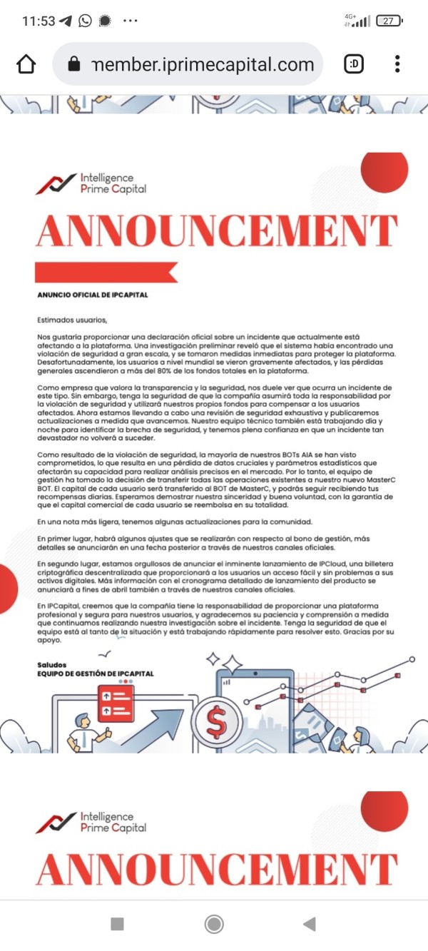 Llevo intentando retirar mis fondos de 6235 usd desde hace más de 3 semanas, he intentado contactar con la compañía por email varías veces por mail y por el chat en vivo, los emails no llegan nunca y el chat en vivo no funciona desde hace 15 días según ellos solo desde el día de ayer 1 de abril que tienen el chat fuera de línea en mantenimiento es imposible a día de hoy contactar con la compañía, en mt4 aparece mi saldo y una retirada que nunca llege a recibir , en el Dashboard de su página web aparece mi saldo a 0 , en el menú a desaparecido la parte de gestión de los activos del bot. El 26 de marzo sufrieron un supuesto hackeo según su comunicado le han robado más del 80% de los activos. Esto es en toda regla un scam . No invierta en IPCAPITAL !!!!