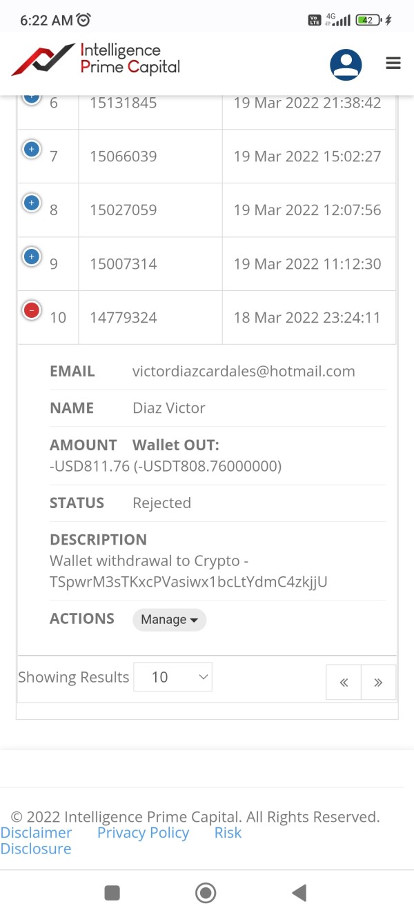 Retiros rechazados desde el 18 de marzo, retiro pendiente del 01 de abril. No cargan las utilidades de las últimas dos semanas. Los saldos disponibles en la billetera para retiro han desaparecido.