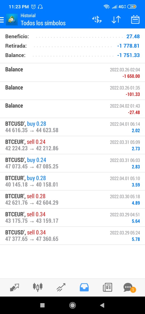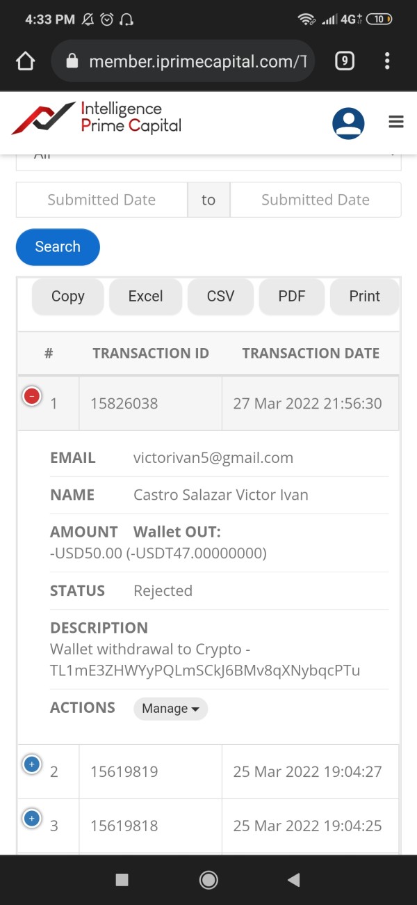 el día 25 de marzo de 2022 a las 19:04 horas, se hizo un retiro de capital del MT4 a la wallet por valor de USDT1.650. quedando un saldo de USDT 384.67. El día 26 de marzo de 2022 se retiro ganancias al broker por valor de 101,33 de lao cuáles IPC debe descontar el 20% el día 27 de marzo de 2022 a la 21:56 horas se hizo una solicitud de retiro por valor de USDT 50, que luego registro cómo rechazada, pero sin reintegro del dinero a la wallet. Tienen en Común estás tres situación que el dia 28 ya no había dinero en mi Wallet personal de IPCAPITAL, registrando USDT 0. No registra ni el retiro de capital, ni el reintegro del retiro rechazado, ni las ganancias de las últimas semanas. Además, no me permite retirar mi dinero a la billetera de mi cuenta cripto, por lo que debo pedir autorización para retirar mi capital. solicito poder lograr que los dineros aparezcan en mi registro y enviados mi wallet de kucoin o binance, para poder hacer uso de ellos...