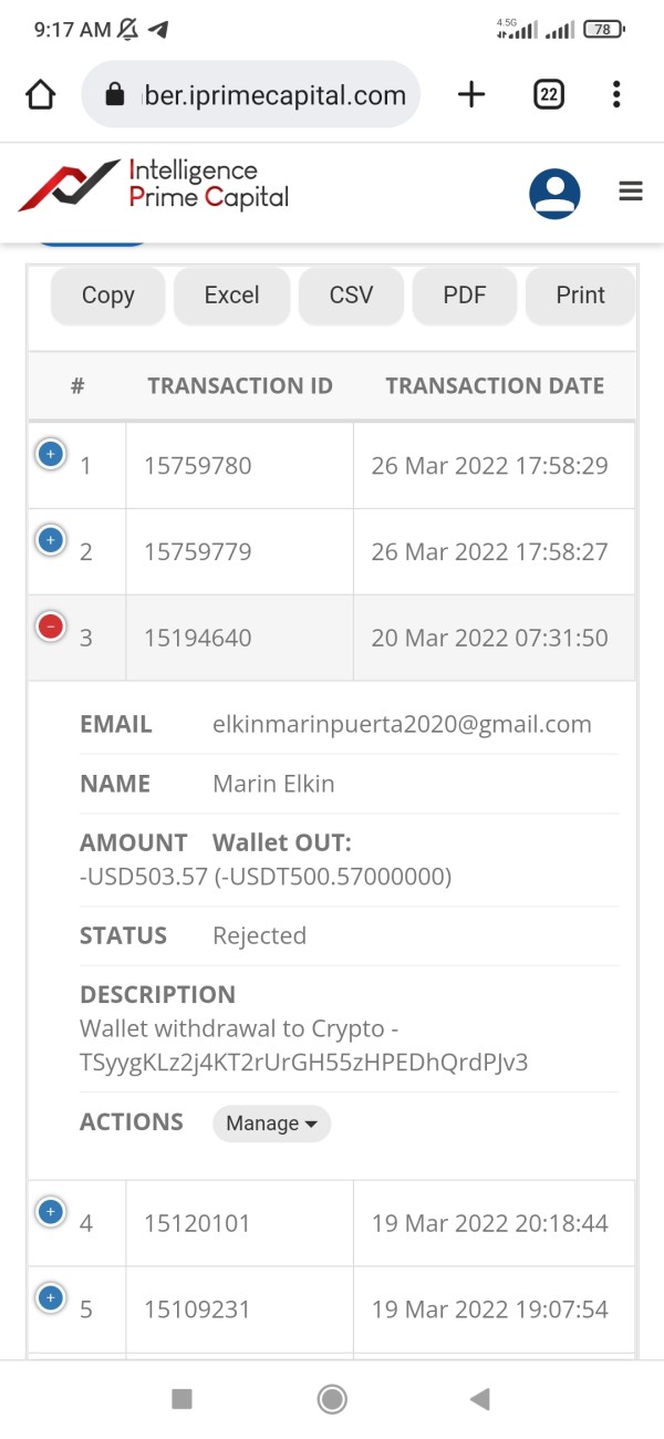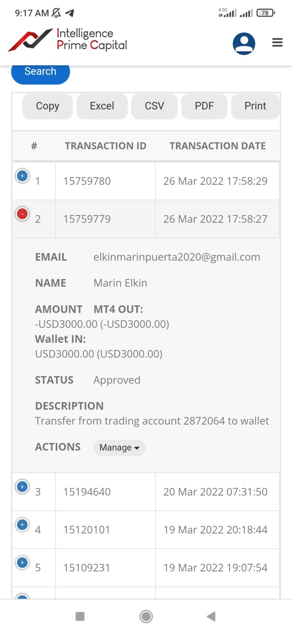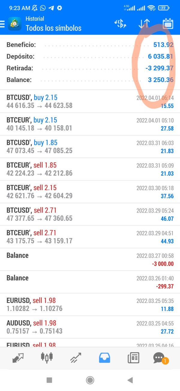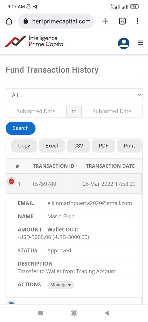 20 de marzo de 2022 realicé un retiro por 503 USD y me lo rechazaron. 26 de marzo de 2022 transferí 3000 USD desde la billetera de mt4 a la wallet interna para poder retirarlos, sin embargo ese mismo día el broker lo retira de la wallet interna supuestamente para trabajarlos pero no sé dónde se encuentra actualmente ese dinero. todo se encuentra en ceros. Tengo retenidos en el broker 6035 USD en total. Espero una pronta respuesta por parte de ustedes y una pronta solución. muchas gracias y adjunto pantallazos como evidencia.