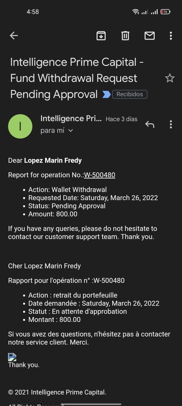 El día de hoy 28 de marzo me salió un mensaje que país no admitido y que debía solicitar el retiro total antes del 27 de marzo, considencialmente había solicitado el retiro de 800 usdt que aún no he recibido y quedaron 202,84 en la cuenta que no puedo solicitar el retiro, ya que me no puedo ingresar a la página. Les adjunto las imágenes de la solicitud realizada y el saldo en la cuenta... muchas gracias!