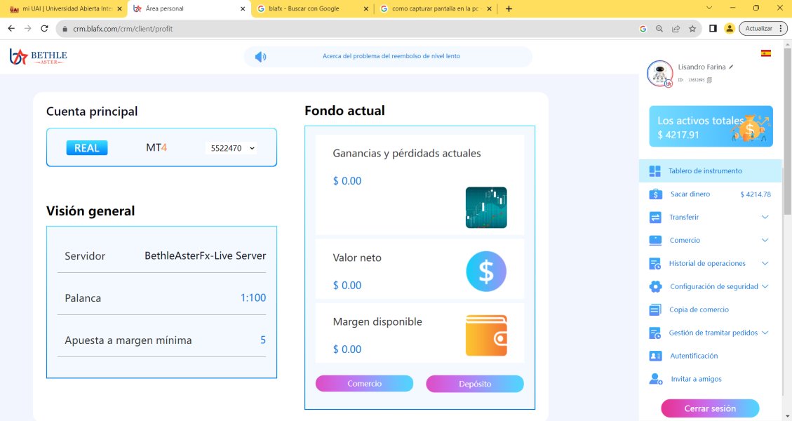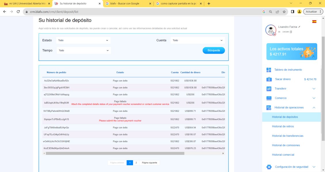 Estimados buenos dias, mi nombre es Lisandro Fariña dni 38839416, mail lisandrofarina12@gmail.com, mi id es 13632695, tengo en mi cuenta 2381 que quiero retirar a mi cuenta de binance, y me informan que la cuenta esta bloqueada que para desbloquearla habia tiempo hasta el 25/8 y deberia depositar el 27% de mi ingreso total, adjunto print de pantalla