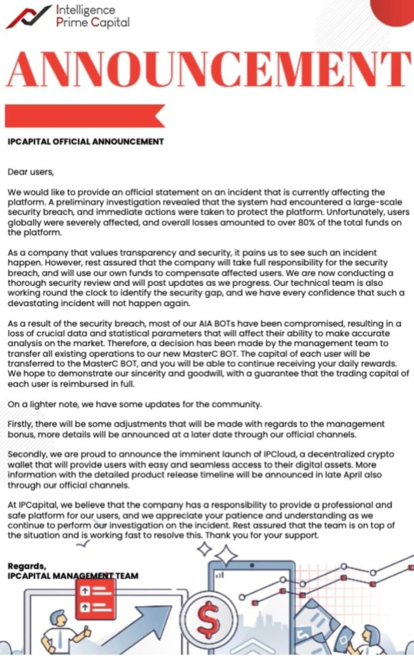 IPCapital said their staff stole 80% of the capital…and they have been feeding us with fake figures on mt4…they rejected our withdrawals and we can’t find in on the platform they are holding it against our wills ..They don’t want to pay us and have locked peoples mt4 accounts on the so called master c robot for 100days …they are preparing to run away…and they are using binance platform to keep our payment