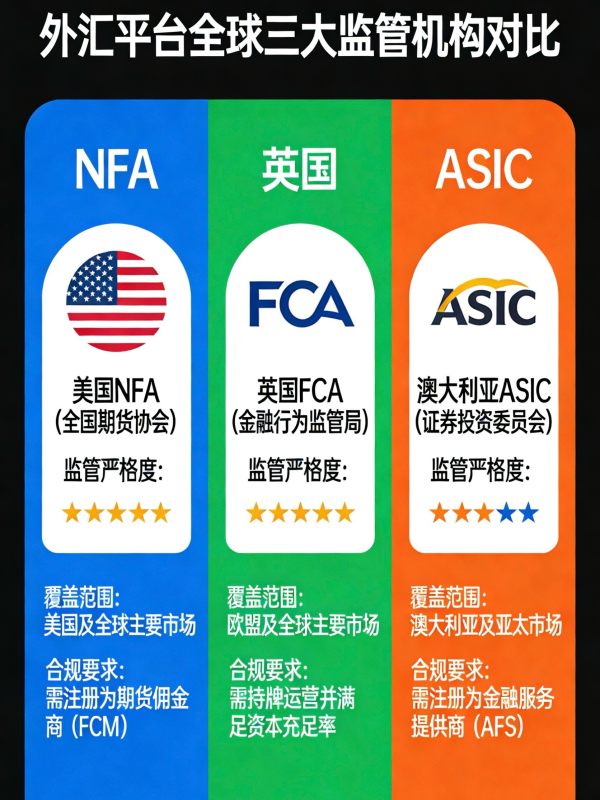 英国FCA、澳洲ASIC、美国NFA是全球外汇三大主流强监管,核心优势各有侧重,以下是精炼对比: