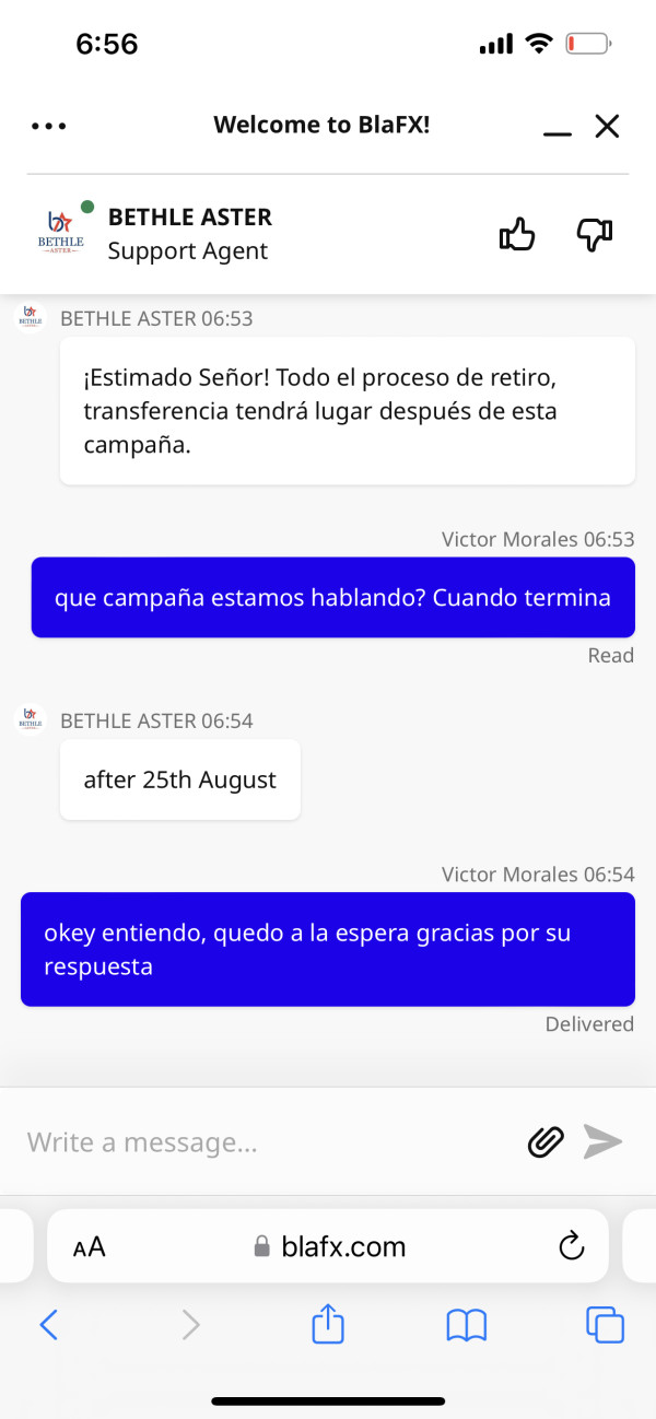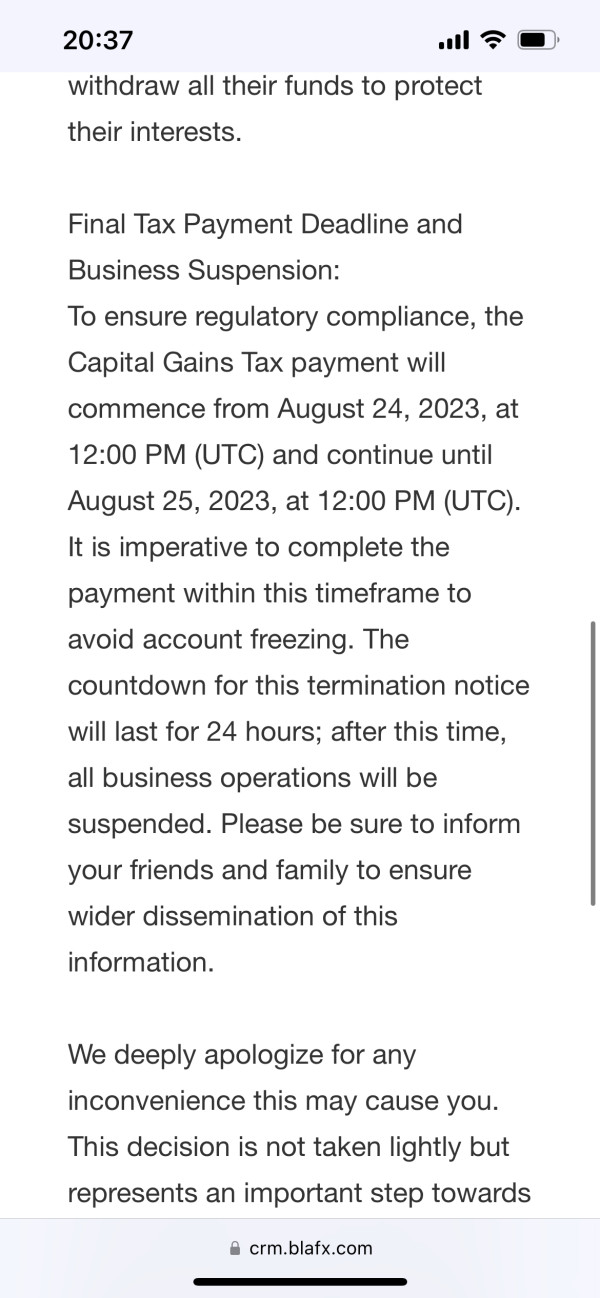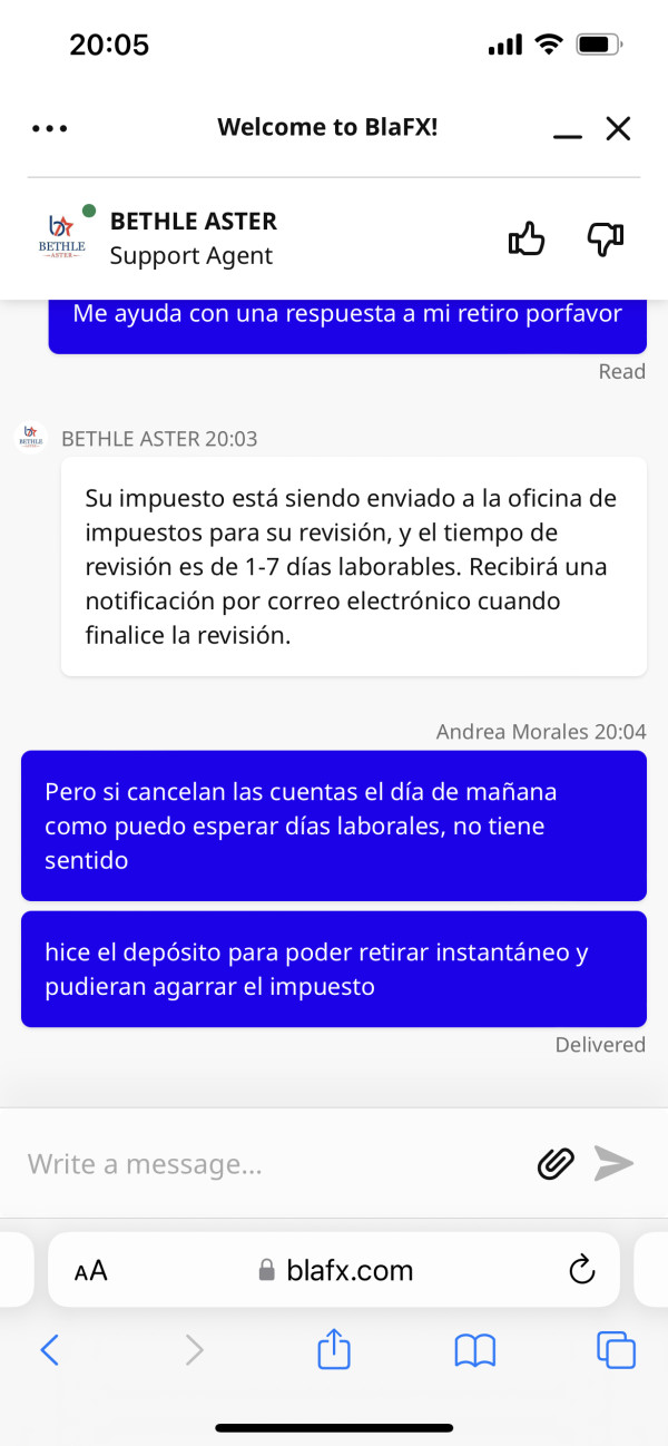 Después del 18 de agosto la aplicación cancelo los retiros y nos dijeron que esperáramos hasta el 25 de agosto y el día 24 de agosto dio comunicado de que todas las cuentas serían canceladas si no depositábamos una cantidad del 27% de impuesto, y me dijo así a muchas personas y cosas diferente. yo tengo una inversión de 2398 Theter USDT y no me deja retirar nada. Muchos conocidos que invirtieron de igual manera lo intentaron y no los dejaron me gustaría su apoyo para poder retirar el dinero invertido dentro de la plataforma. o la cantidad que se pueda recuperar en su defecto, el servicio a cliente solo te daba respuestas sin sentido y diferentes todo el tiempo. Quedó pendiente de su apoyo con esta pagina fraudulenta, gracias.