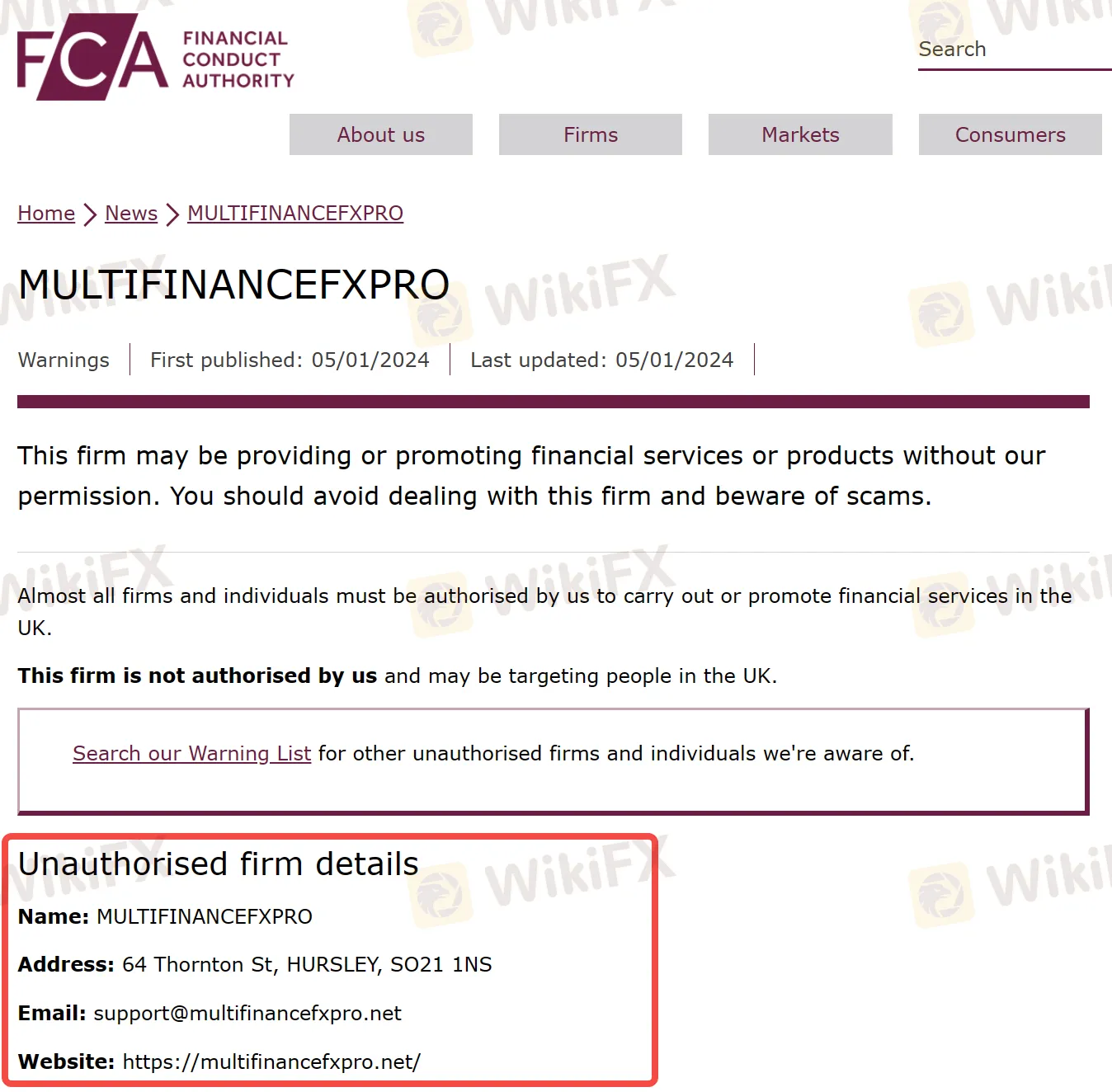 FCA认为MULTIFINANCEFXPRO存在欺诈投资者、非法集资等严重违法行为的可能。并警告投资者不要与该公司进行任何交易或投资,如果一旦遭受资金损失,将无法使用金融申诉专员服务或受到金融服务补偿计划 (FSCS) 的保护。