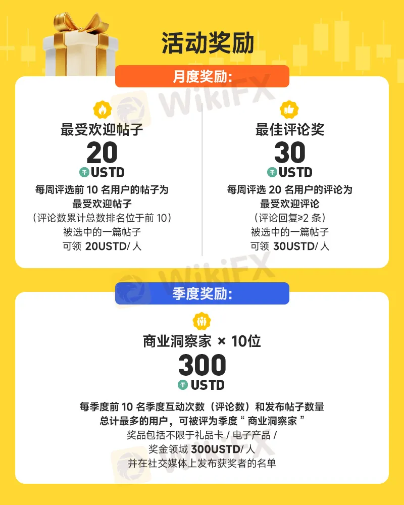 ①.月度奖励:最受欢迎帖子:每周评选前10名用户的帖子为最受欢迎帖子(评论数累计总数排名),被选中的一篇帖子可领 20USTD/人。·