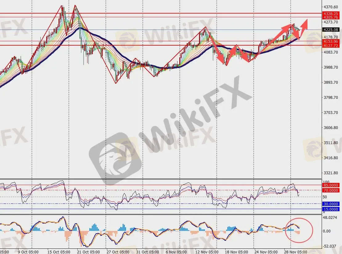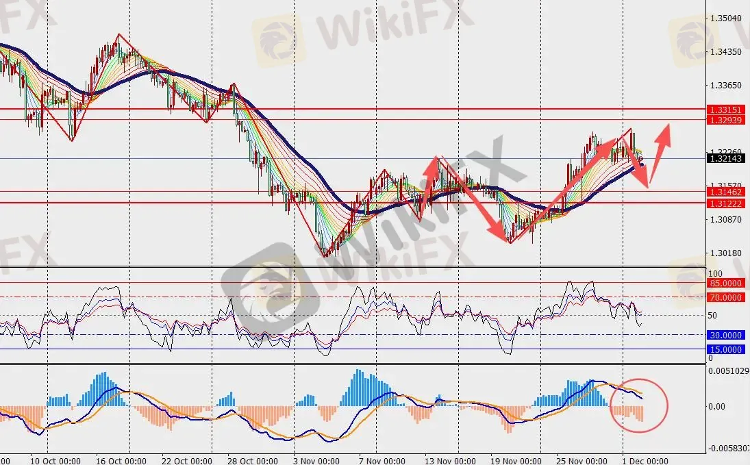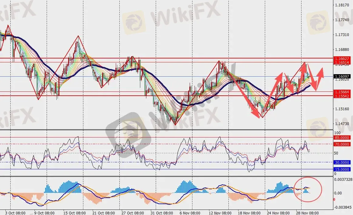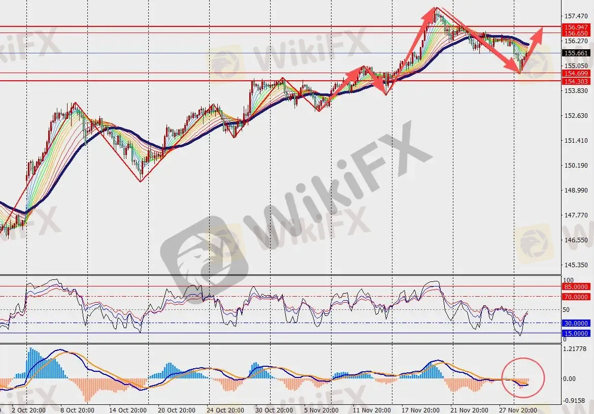 技术面:美元兑日元H4级别下跌反弹,但依旧在48日多空分界线下方。另一方面,MACD双线和量能柱在零轴附近底背离收敛。尽管日本第三季度资本支出同比增长2.9%,增速较前期7.6%明显放缓,但该数据并未削弱市场对日本经济温和复苏的信心。