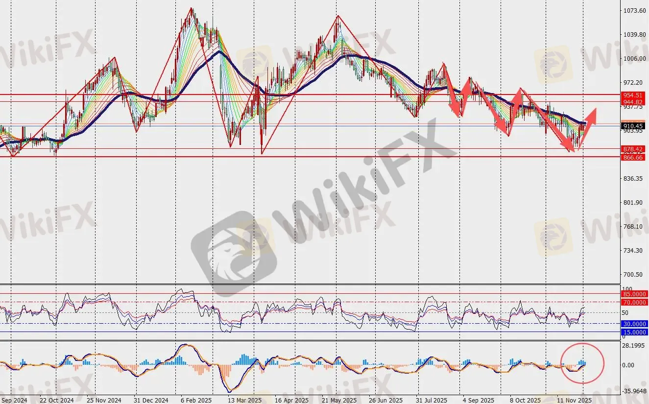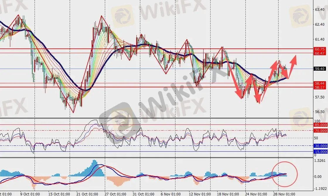 技术面:原油H4级别遇阻徘徊,并在48日多空分界线上方运行。另一方面,MACD双线和量能柱在零轴附近缩量。在此背景下,原油市场短期内的地缘溢价有所抬升,而需求端的不确定性仍使投机资金保持审慎态度。