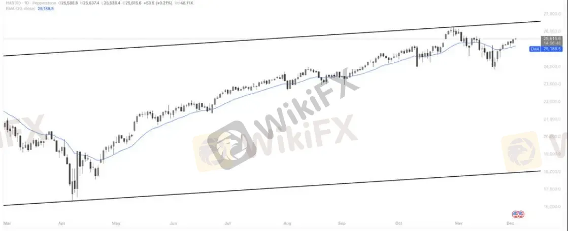 纳指100目前在日线级别维持稳健上行结构,价格重新站上 20 日均线(EMA20),并沿着均线缓步向上推进。从结构上看,指数正逼近年内上升通道的上轨区域(约 26,000–26,800 区间),属于典型的“高位震荡后再试压力”走势。只要价格持续稳站在 EMA20 之上,短线趋势仍偏多;但由于已接近通道压力,向上突破需等待下周(12/9–12/18)的密集宏观数据确认。在数据未落地前,指数大概率维持高位横盘偏强格局,节奏由 AI、云端及大型科技财报与题材股驱动。
